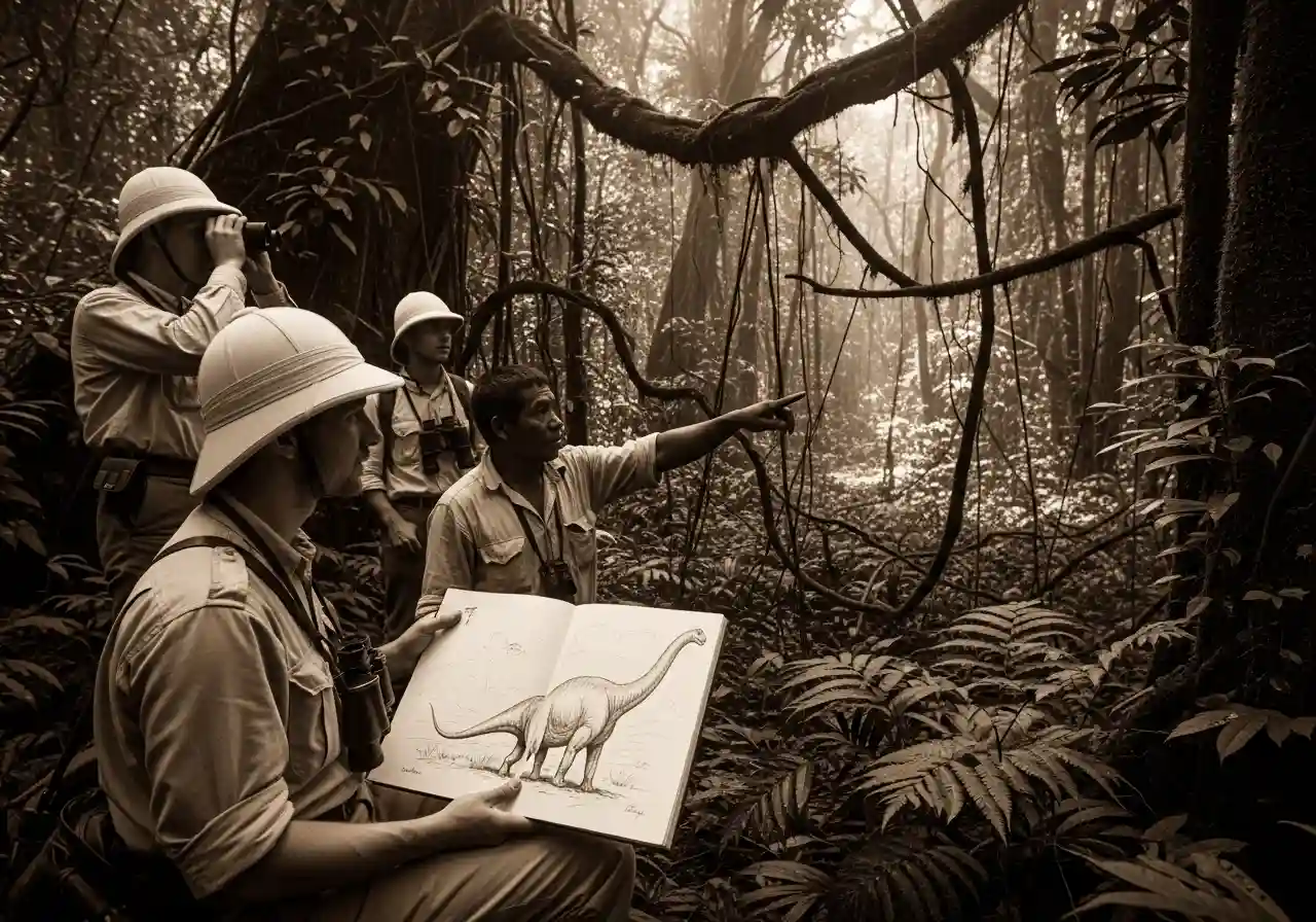 Sepia-toned illustration of a 1910s German expedition team looking at a sketch of a sauropod shown by a local guide.