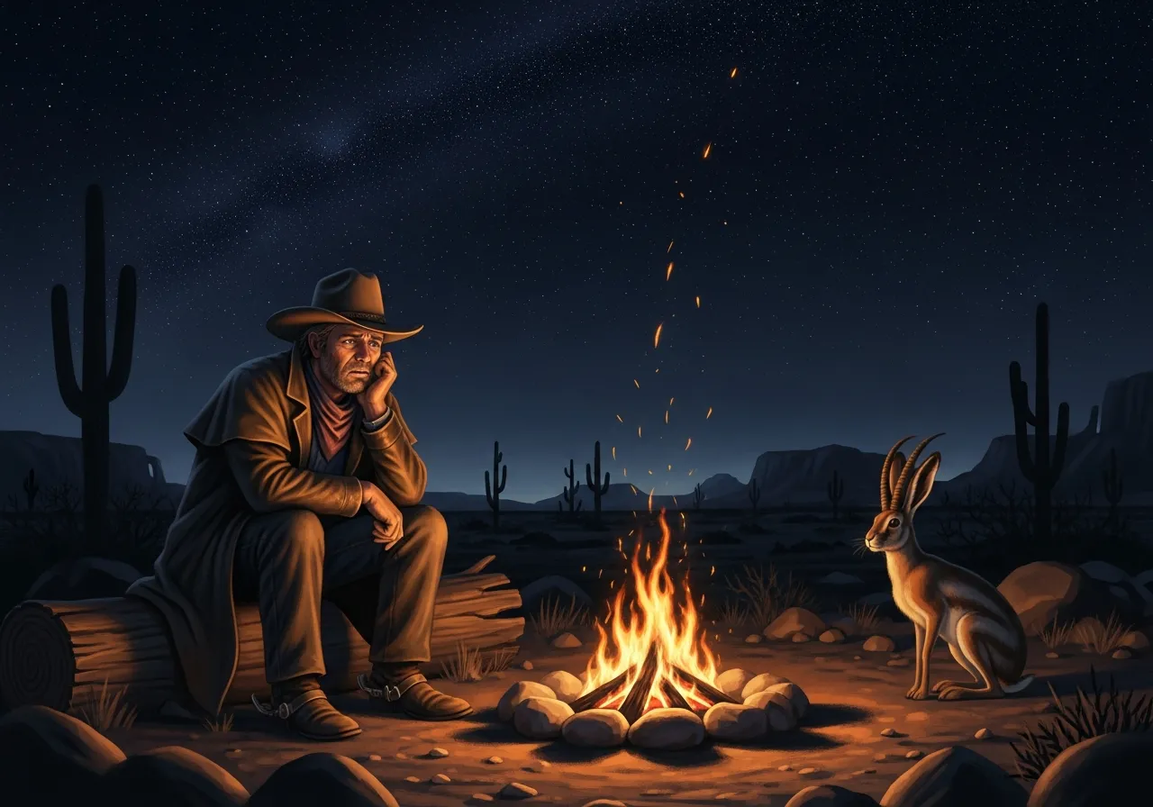 Digital painting of a cowboy hearing a Jackalope sing by a campfire