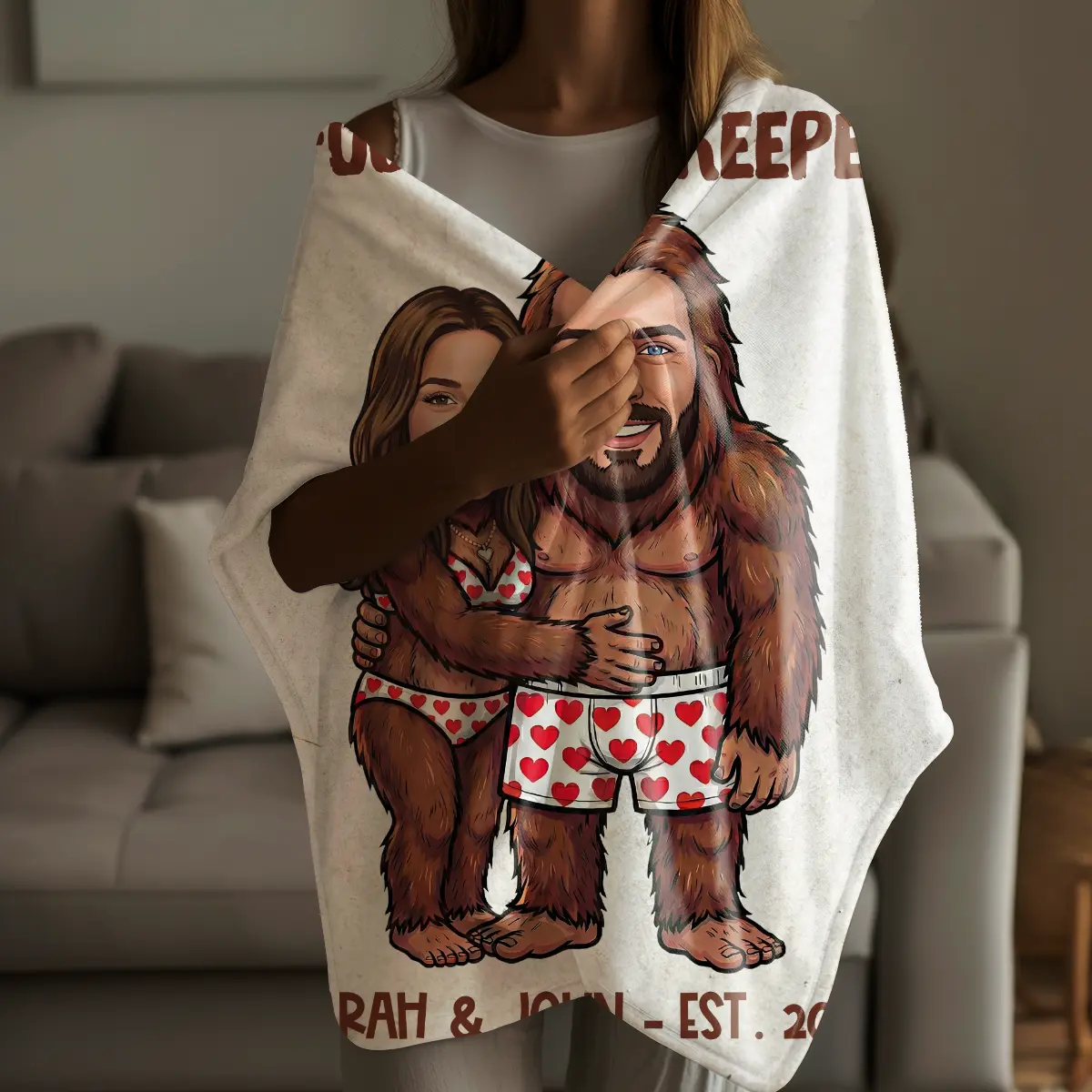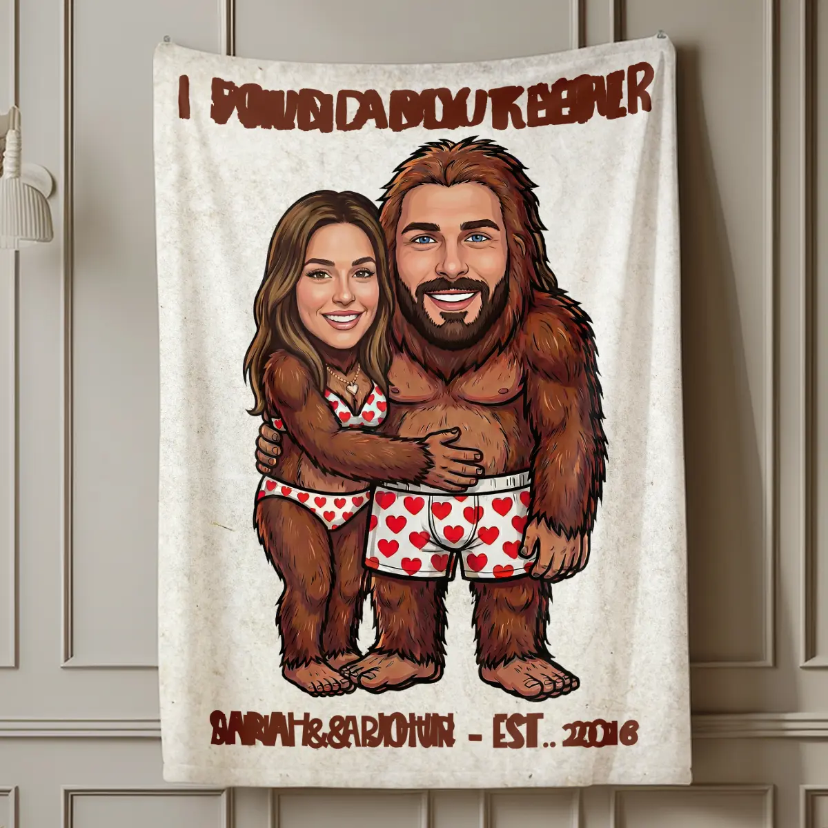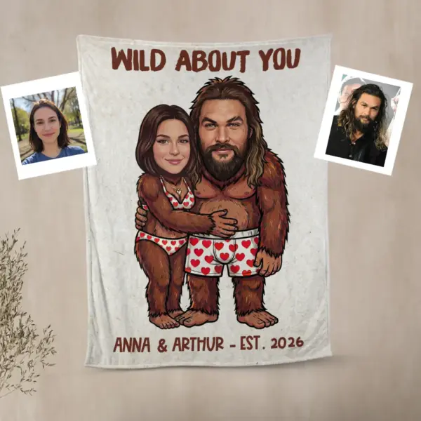 The blanket showcases your custom faces expertly integrated onto an adorable Bigfoot couple, playfully hugging in their heart-patterned underwear. Above them, a sweet message like “I FOUND MY KEEPER” or “WILD ABOUT YOU” adds a charming touch, while your names and established year are proudly displayed below. The hand-drawn cartoon style and vibrant colors make this a truly unique and heartwarming piece.