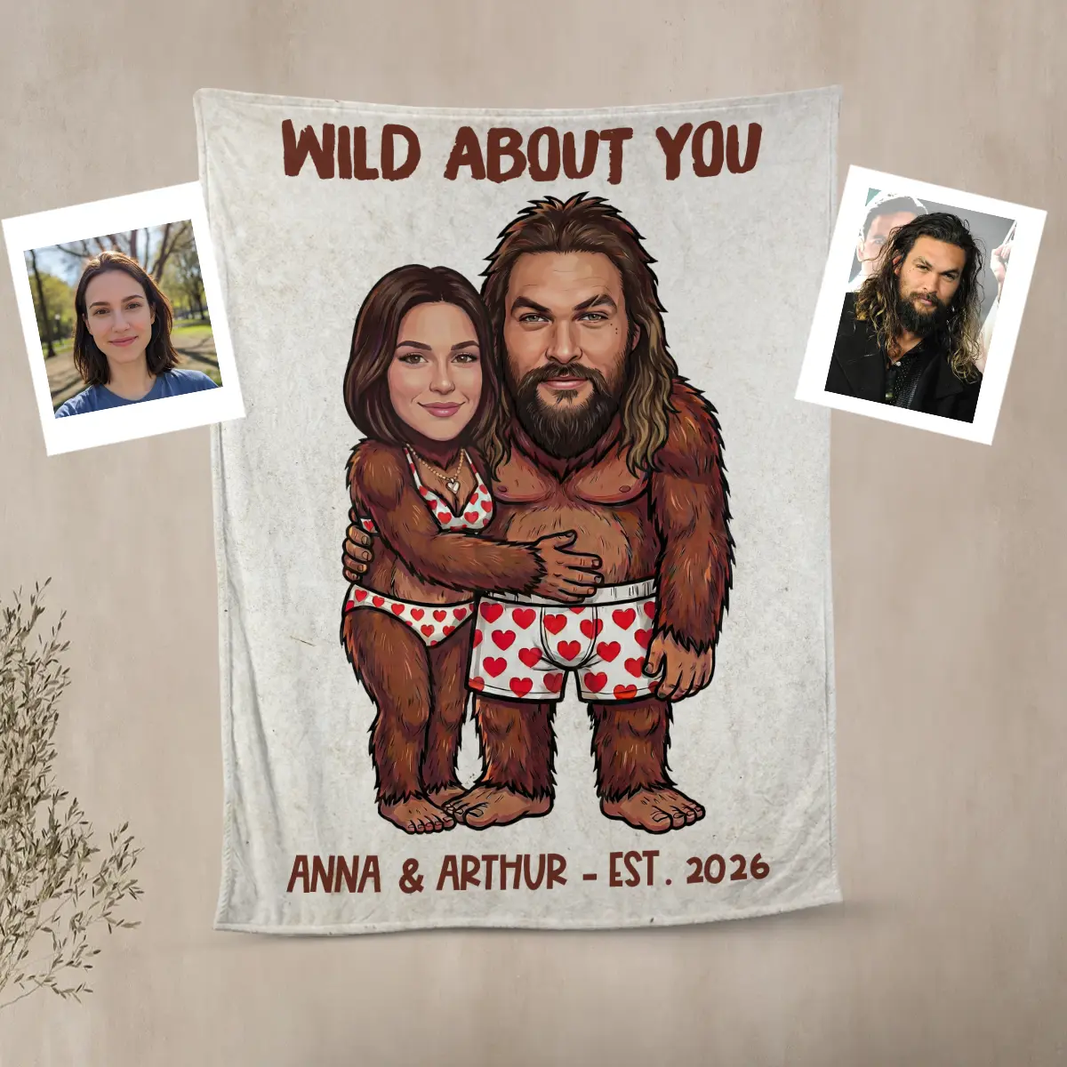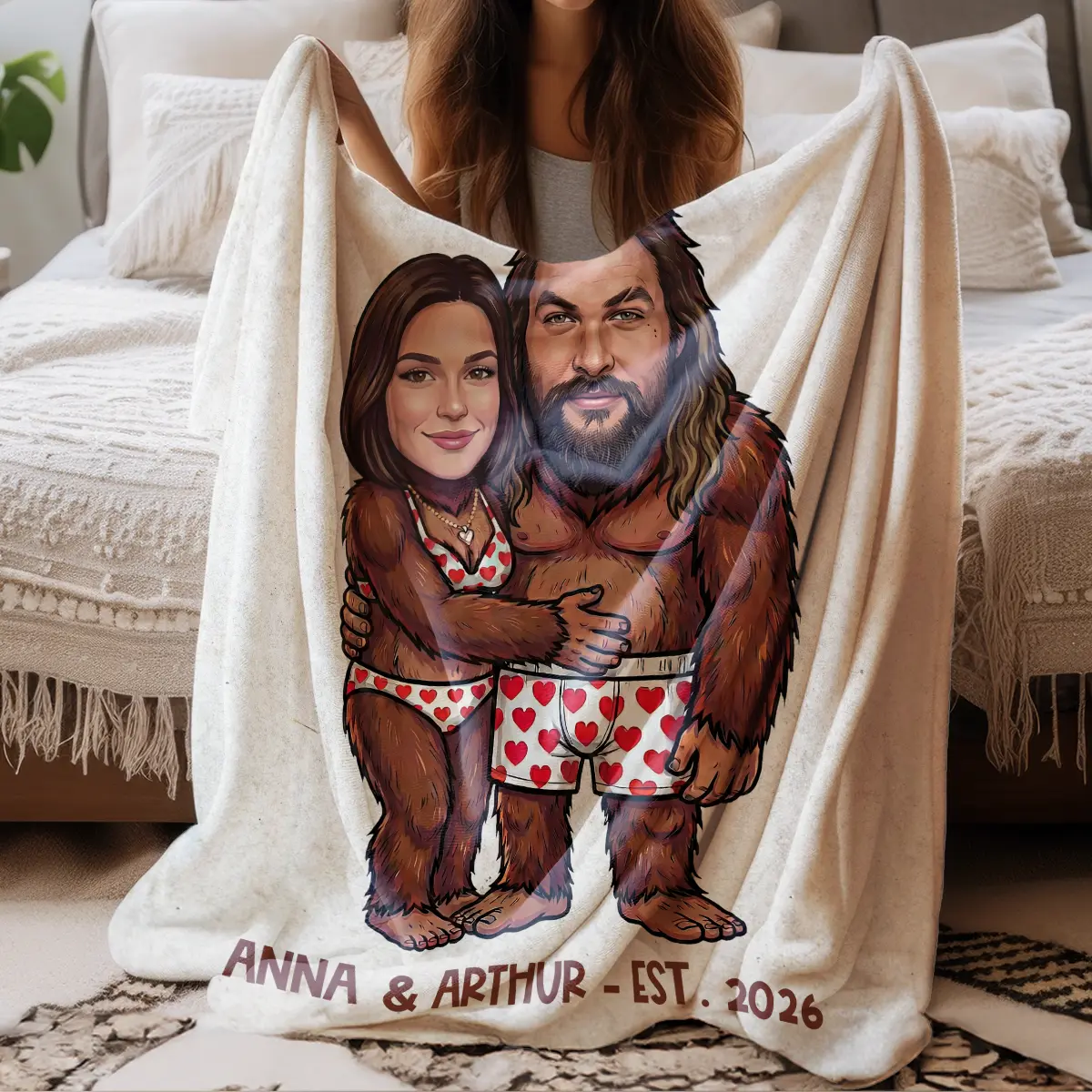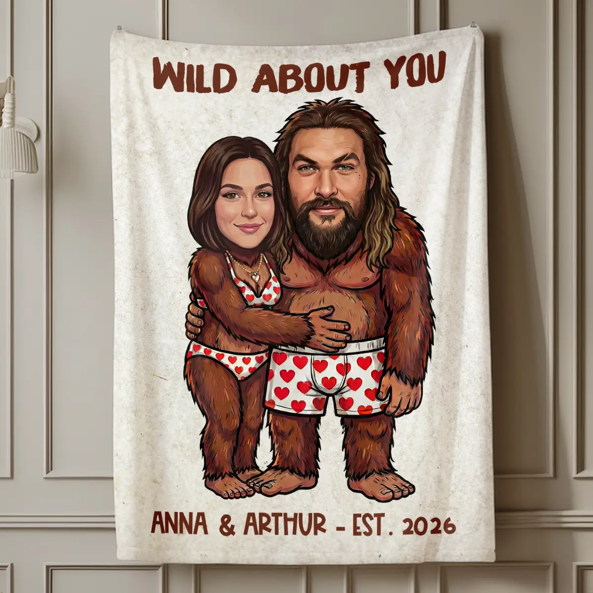 The blanket showcases your custom faces expertly integrated onto an adorable Bigfoot couple, playfully hugging in their heart-patterned underwear. Above them, a sweet message like “I FOUND MY KEEPER” or “WILD ABOUT YOU” adds a charming touch, while your names and established year are proudly displayed below. The hand-drawn cartoon style and vibrant colors make this a truly unique and heartwarming piece.