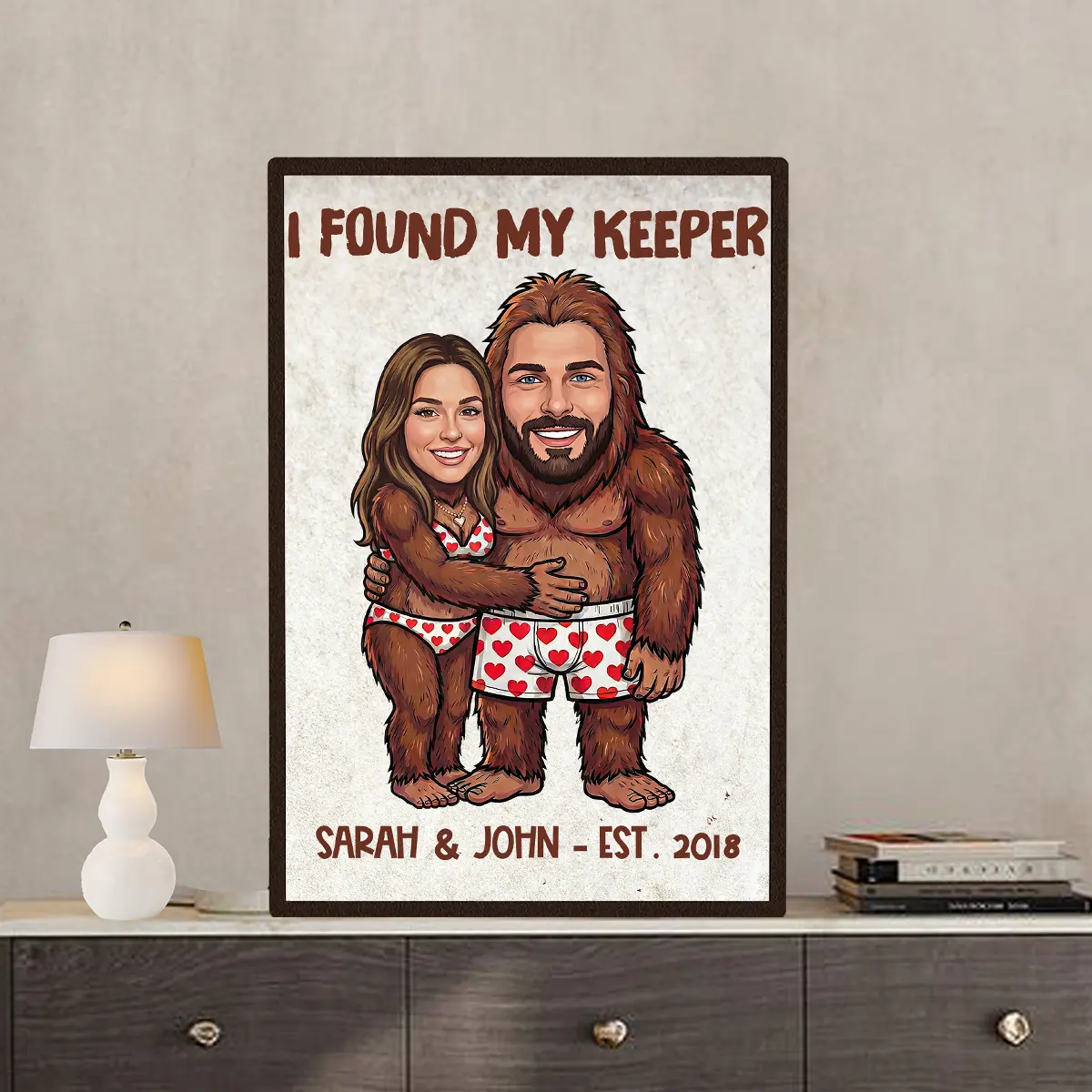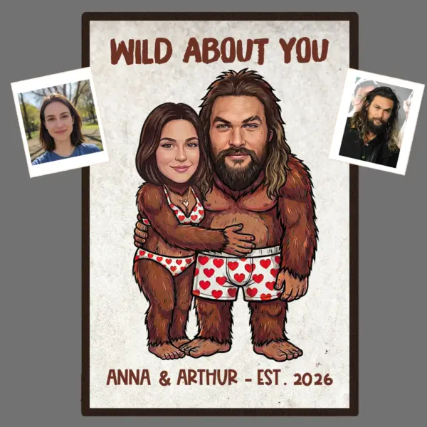 The poster features your custom faces expertly integrated onto an adorable Bigfoot couple, playfully hugging in their heart-patterned underwear. Above them, features editable text! Change it to ‘Wild About You’, ‘I Found My Keeper‘, or any funny quote you love., while your names and established year are proudly displayed below. The hand-drawn cartoon style and vibrant colors make this a truly unique piece of art.