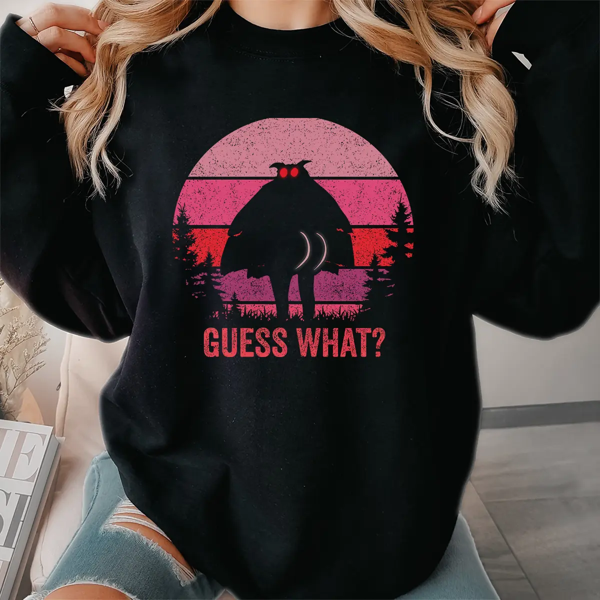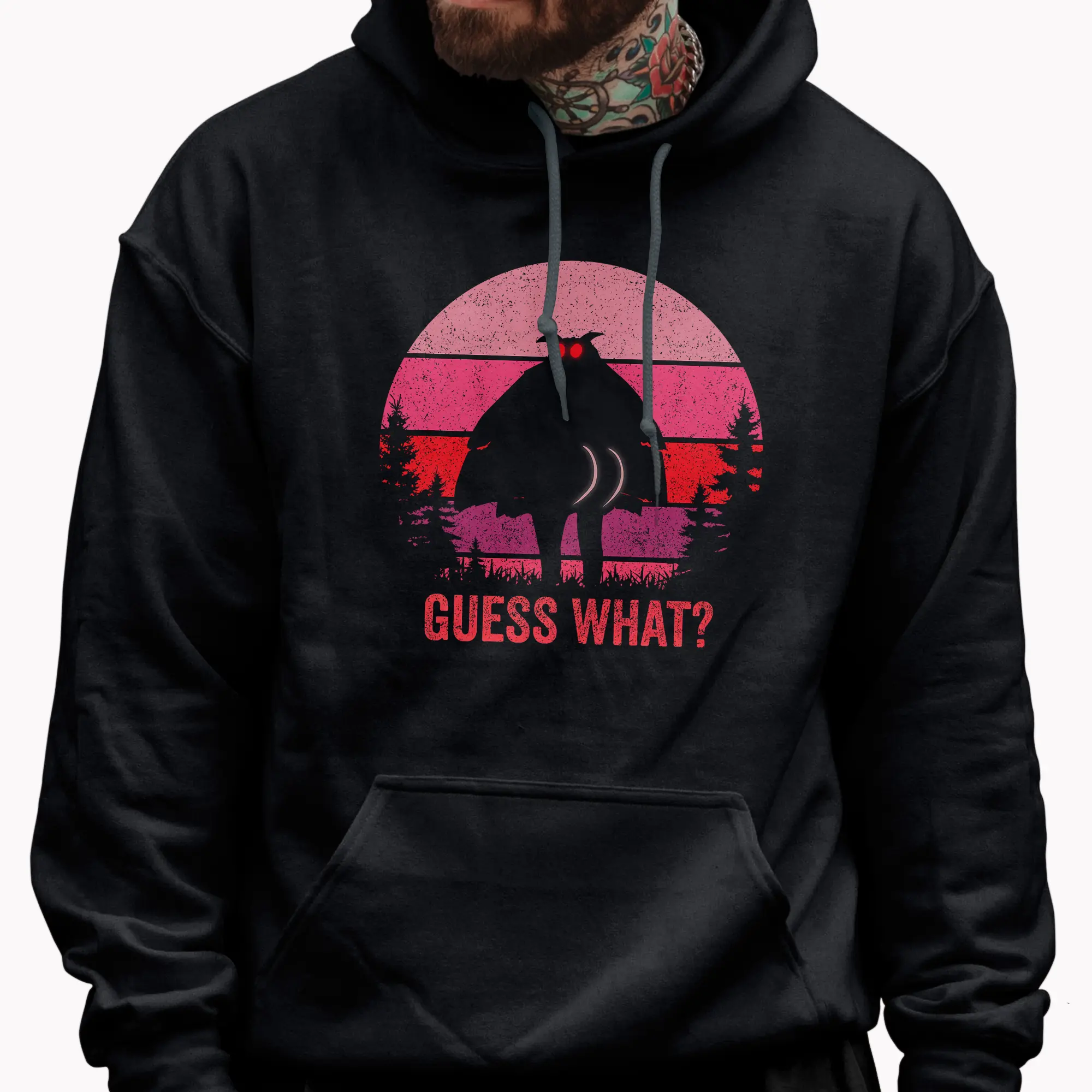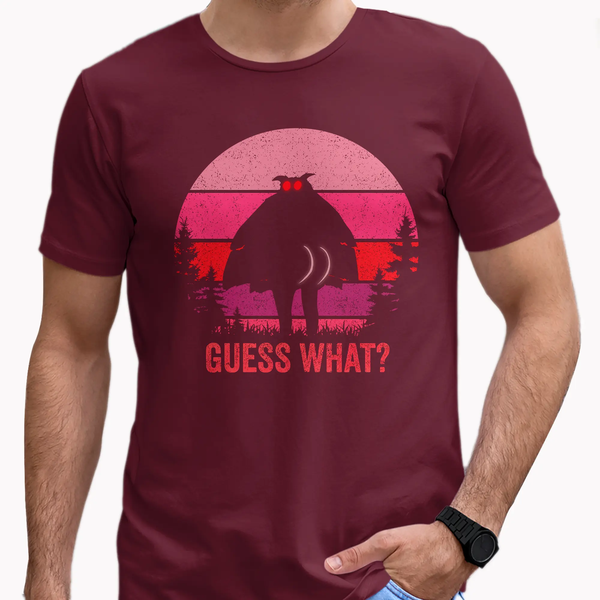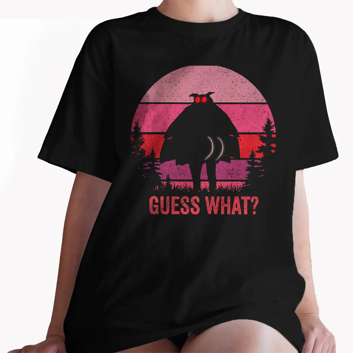 The design features the iconic silhouette of the Mothman, complete with its piercing red eyes, boldly turning to reveal its… well, you know. This humorous stance is set against a vibrant retro sunset with horizontal stripes in shades of soft pink, fuchsia, and deep red, framed by dark pine trees. Below this unforgettable cryptid, the bold, distressed text “GUESS WHAT?” adds to the playful reveal, making it a truly unique statement piece.