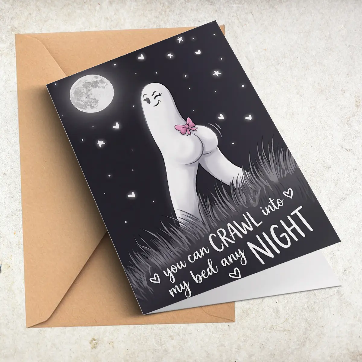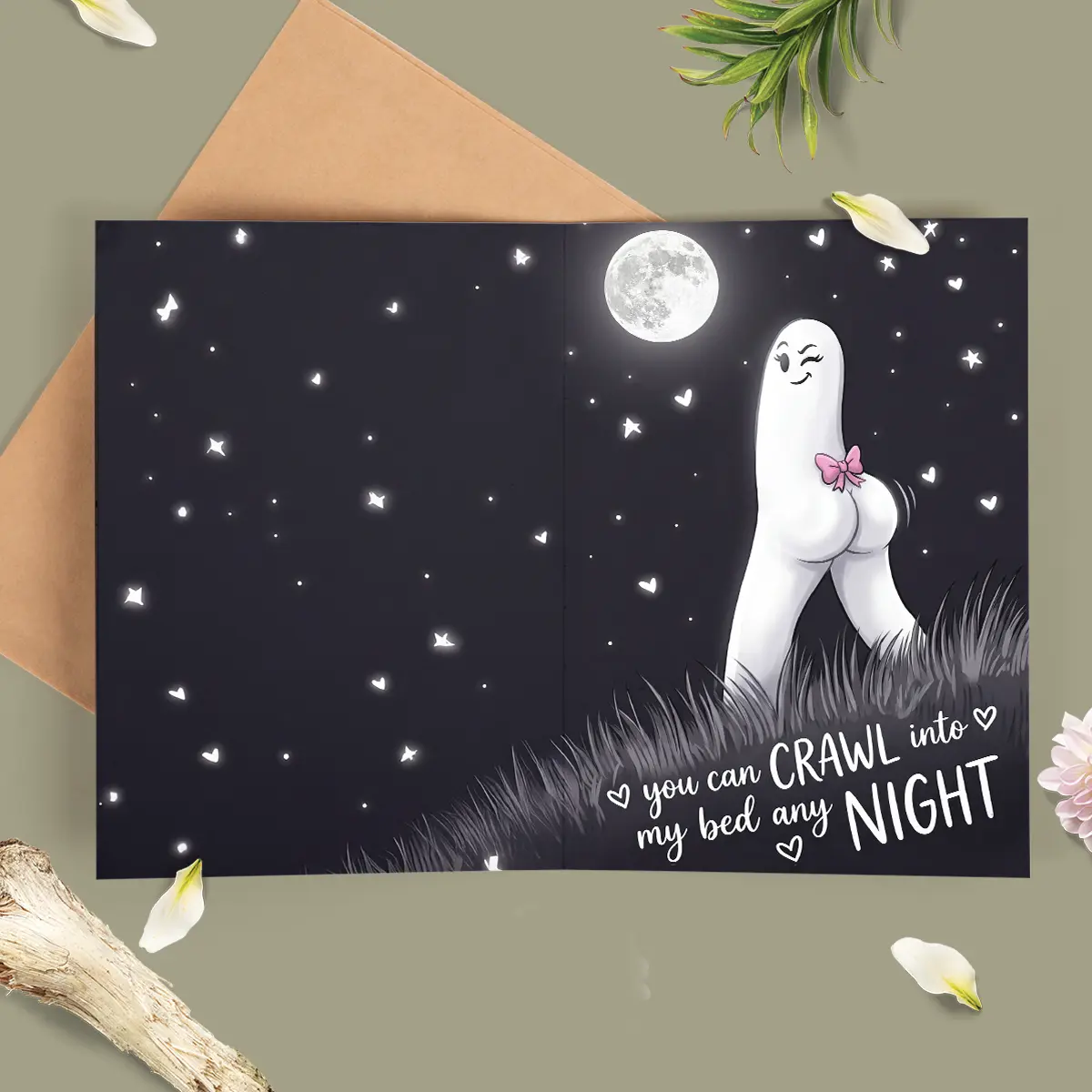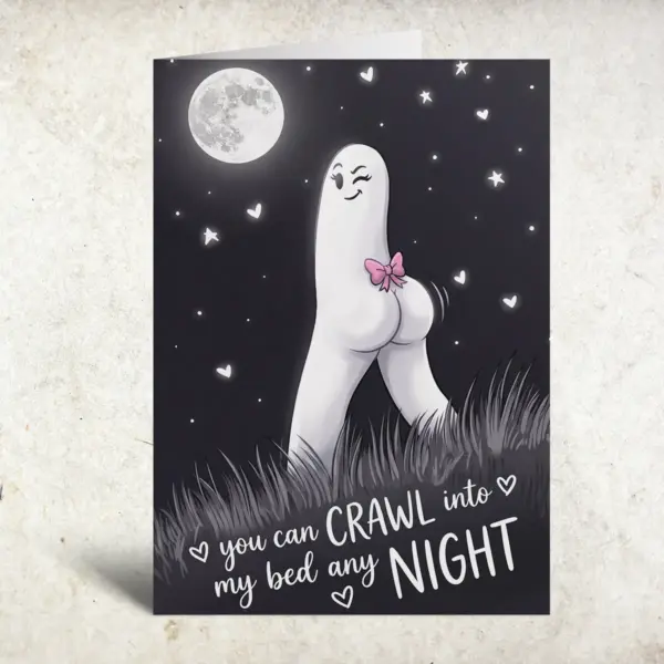 The card showcases a delightfully plump white Fresno Nightcrawler, complete with a cute winking face and a charming pink bow adorning its emphasized backside. It’s depicted waddling in a moonlit, grassy landscape under a sky sprinkled with sparkling stars and tiny hearts, setting a romantic yet mischievous scene. It’s more than just a card; it’s a memorable token of affection that combines the allure of cryptid lore with a truly personal and humorous touch.