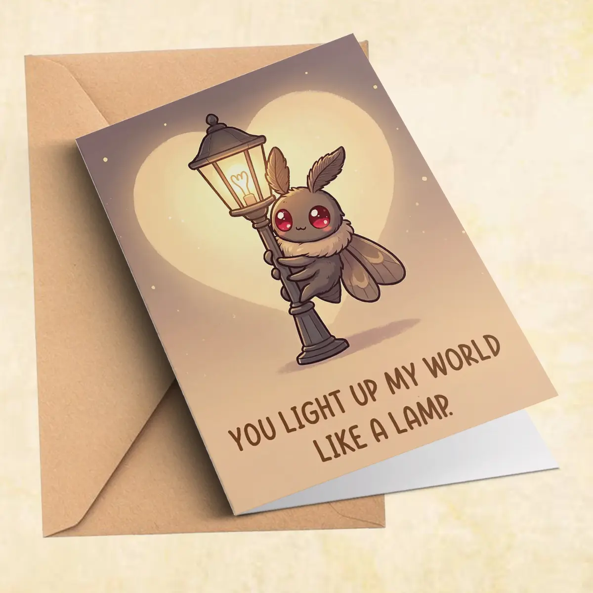 The card showcases a super cute, kawaii-style Mothman, with huge, sparkling red eyes and fluffy antennae, sweetly clinging to a classic street lamp. The lamp casts a warm, heart-shaped glow, symbolizing love and light, against a soft, muted background with subtle stars. Below this endearing scene, the sweet and funny message “YOU LIGHT UP MY WORLD LIKE A LAMP.” is prominently displayed in a friendly brown font, capturing the playful spirit of this cryptid.