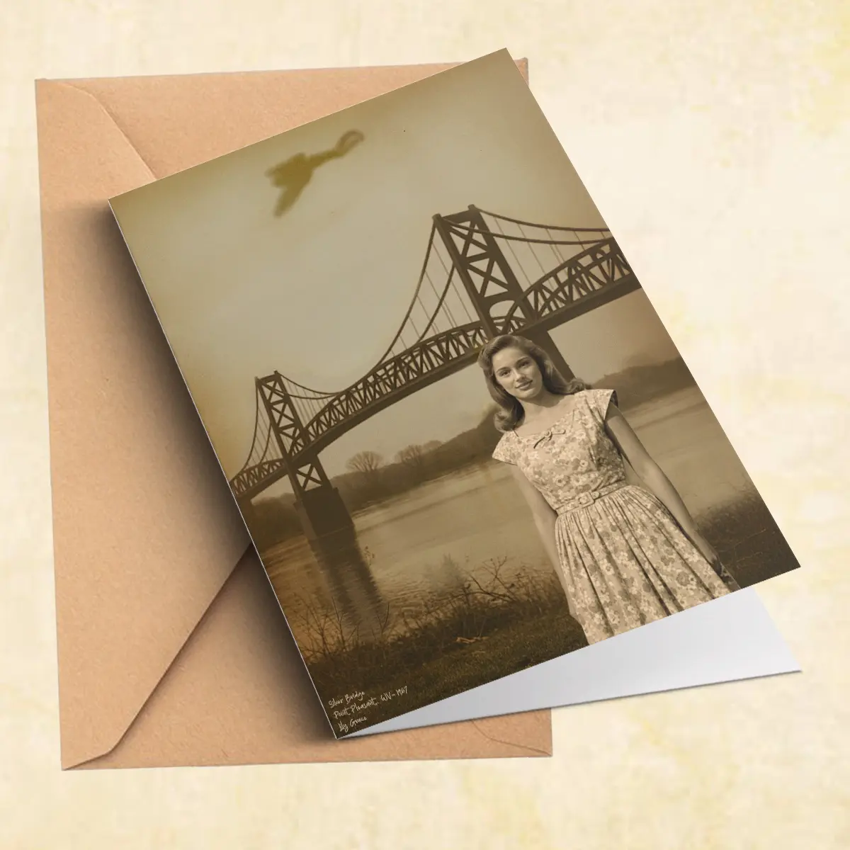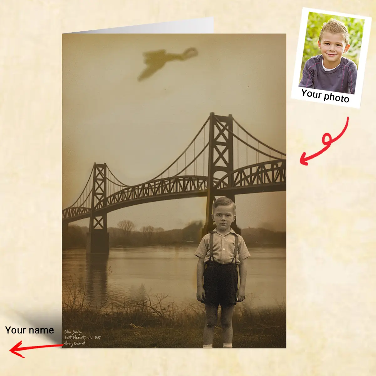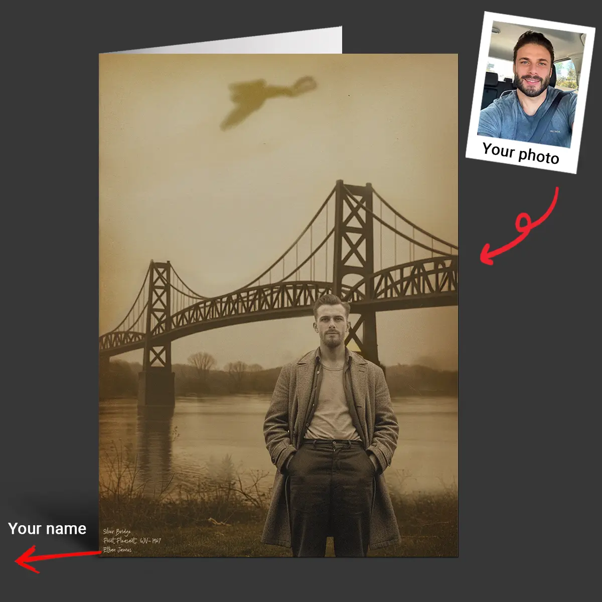 Step back in time to the eerie year of 1967 with our Personalized 1967 Mothman Sighting Card. Before the tragedy of 1967, whispers filled Point Pleasant of a dark omen above the Silver Bridge. This artwork places you in that final, haunting moment of calm before the collapse.