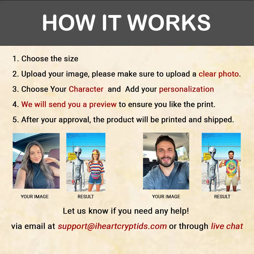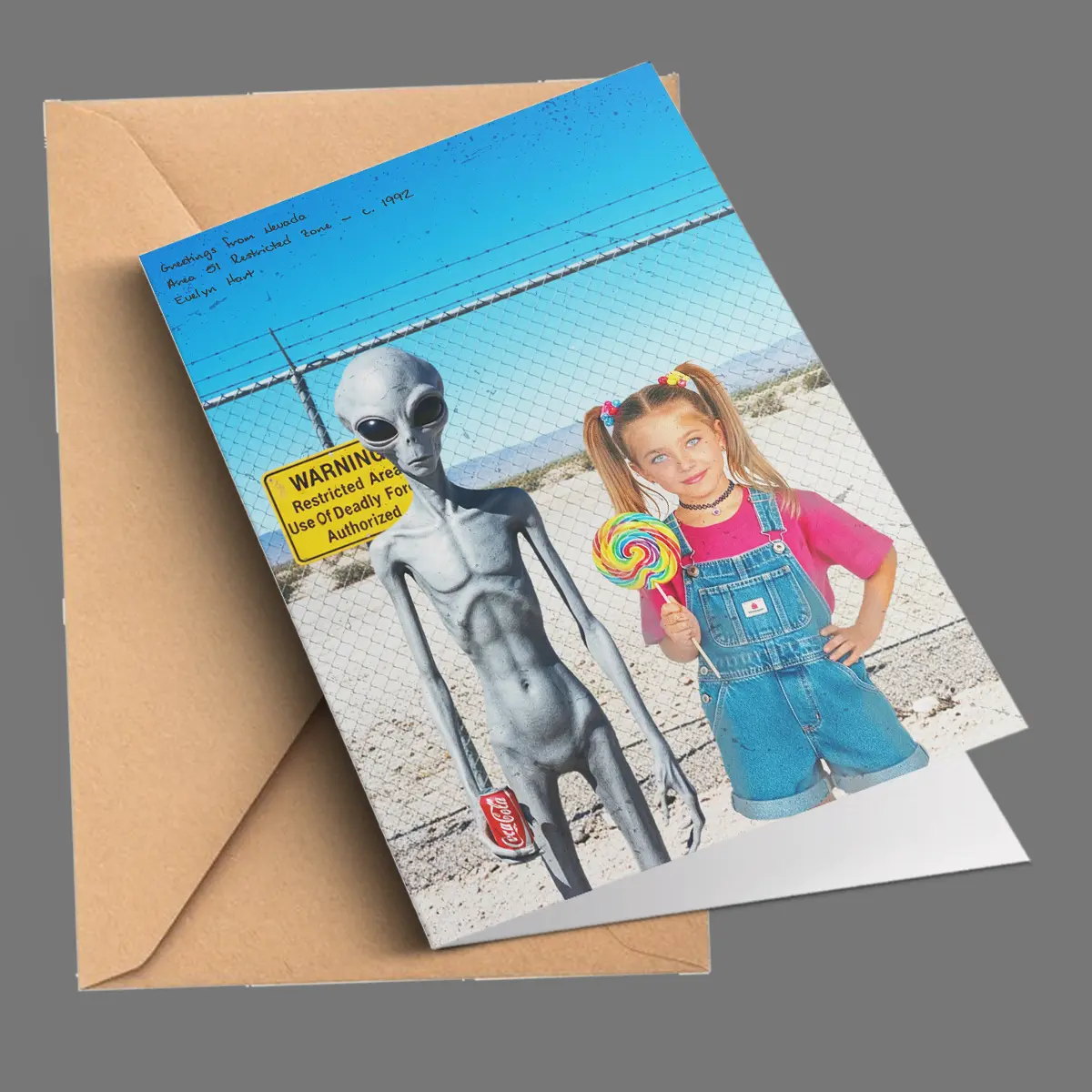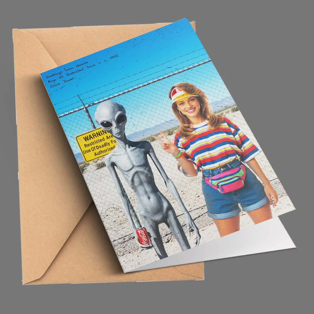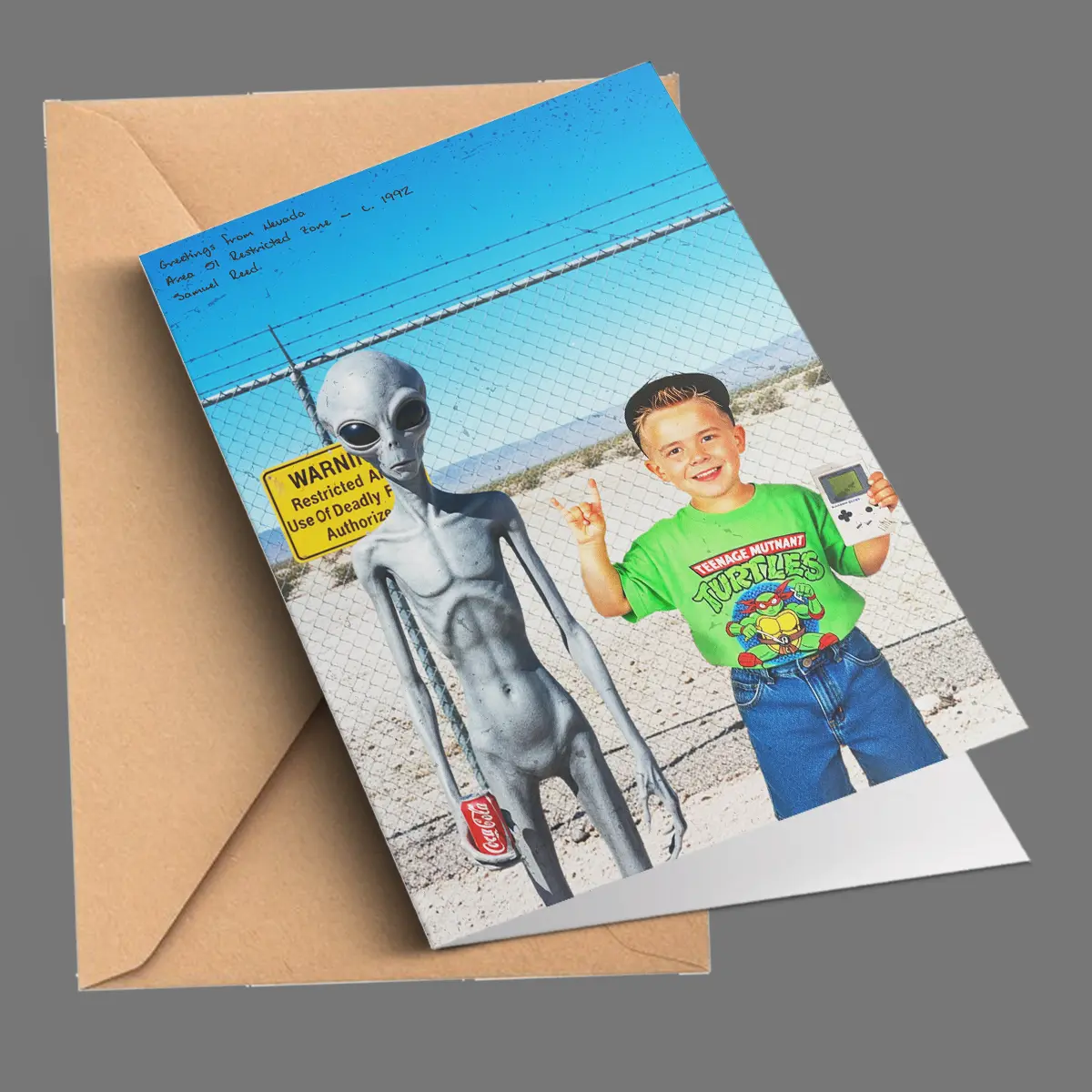 Personalized 1990s Area 51 Alien Card | Custom Face in Funny Retro Vacation Pic, 90s Kitsch Greeting Card