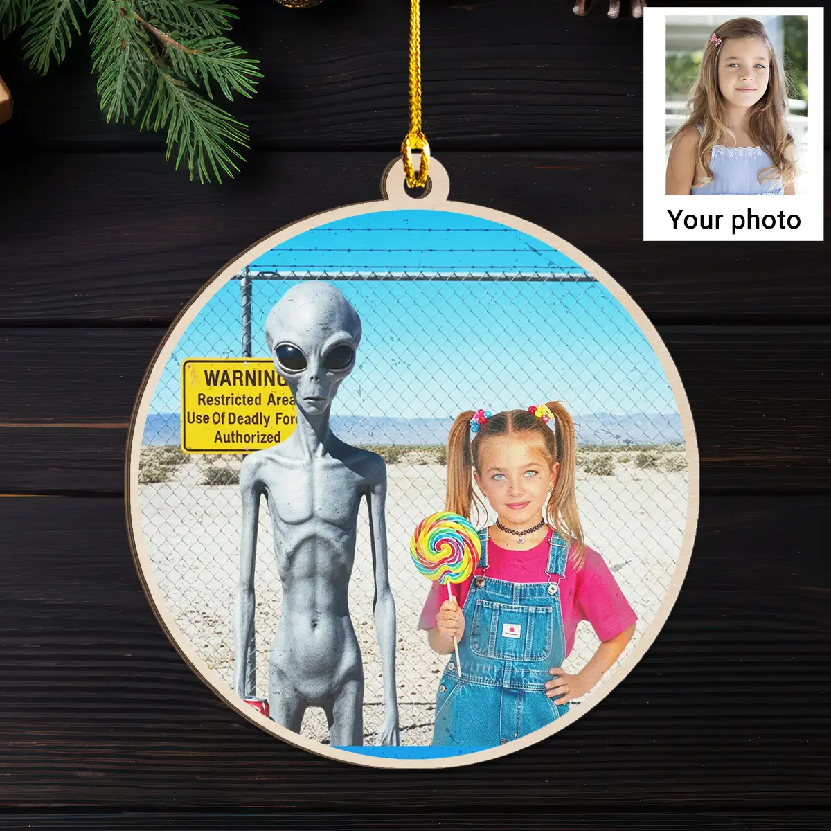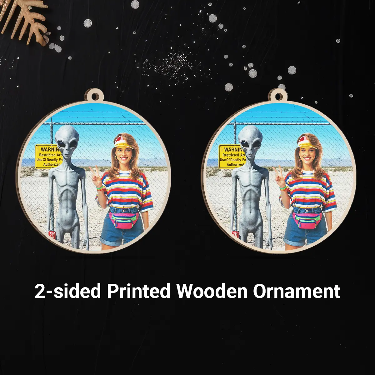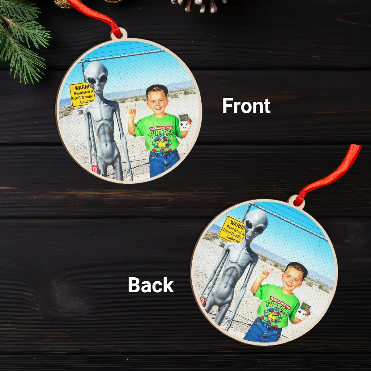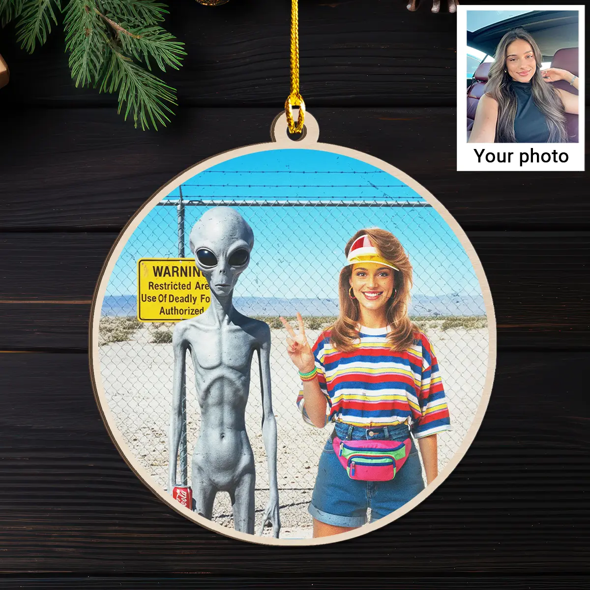 Hang a slice of 90s nostalgia on your tree this year with our Personalized 1990s Area 51 Alien Wooden Ornament.