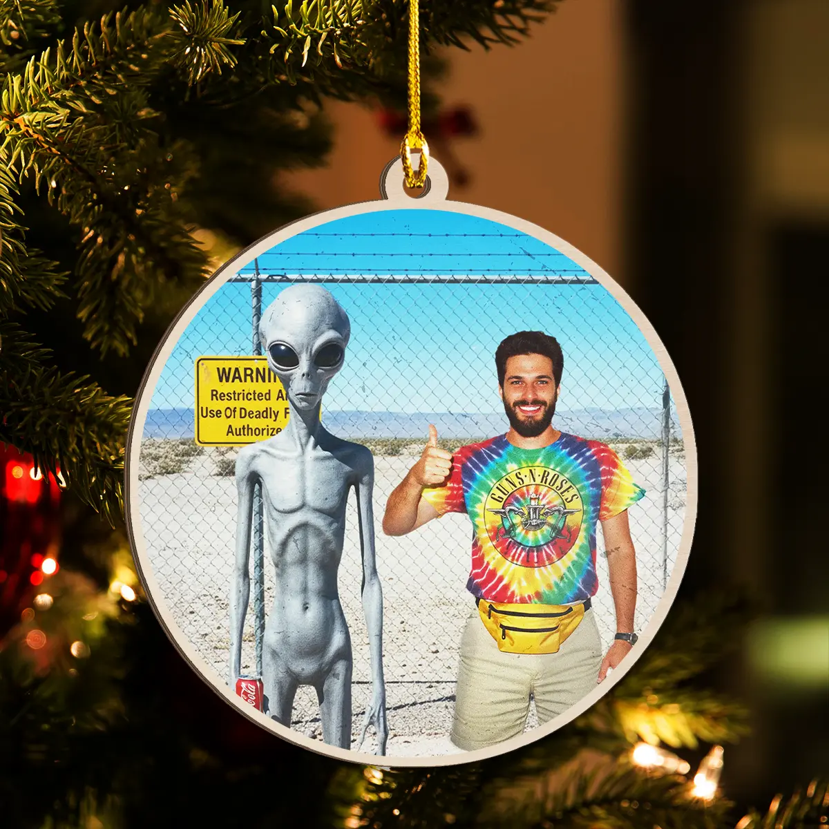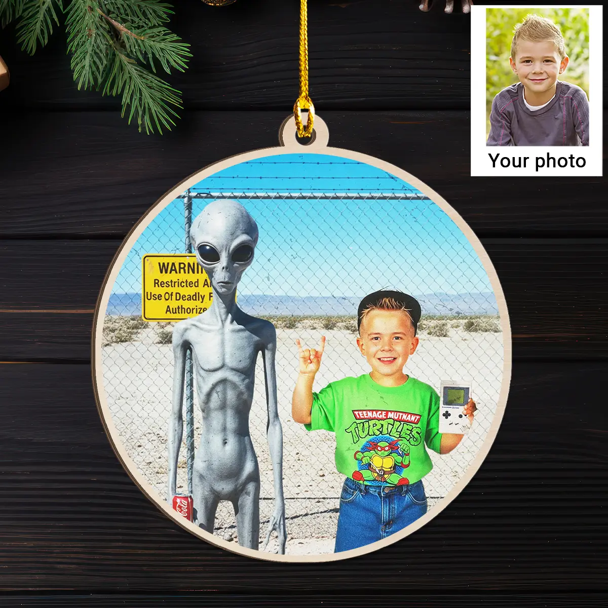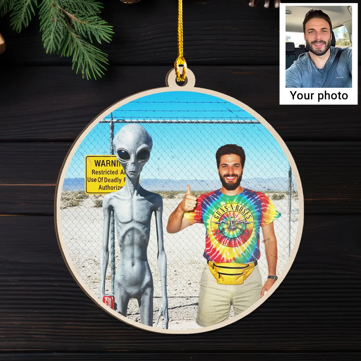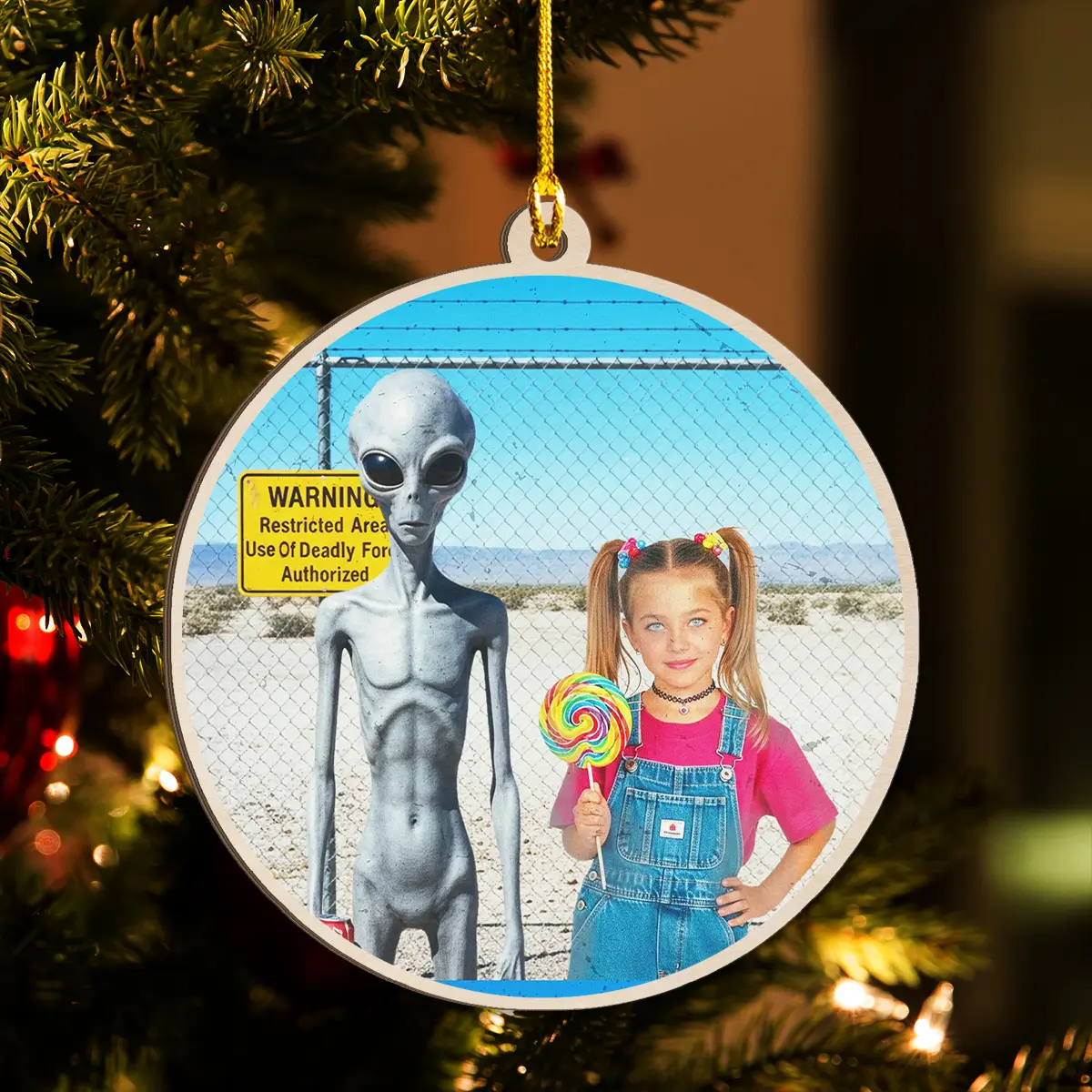 Hang a slice of 90s nostalgia on your tree this year with our Personalized 1990s Area 51 Alien Wooden Ornament.