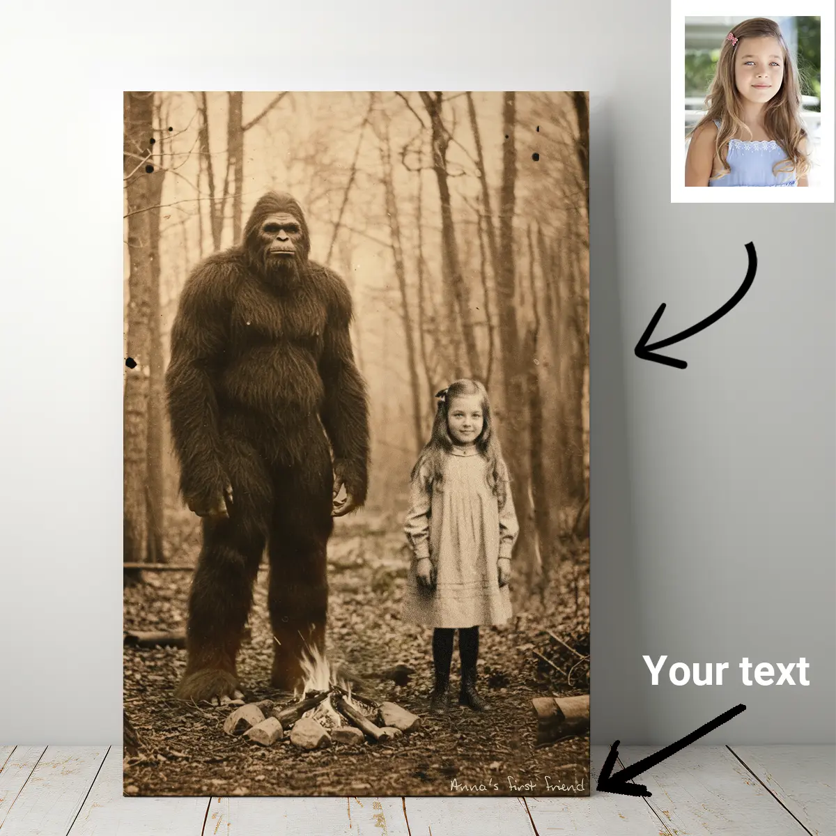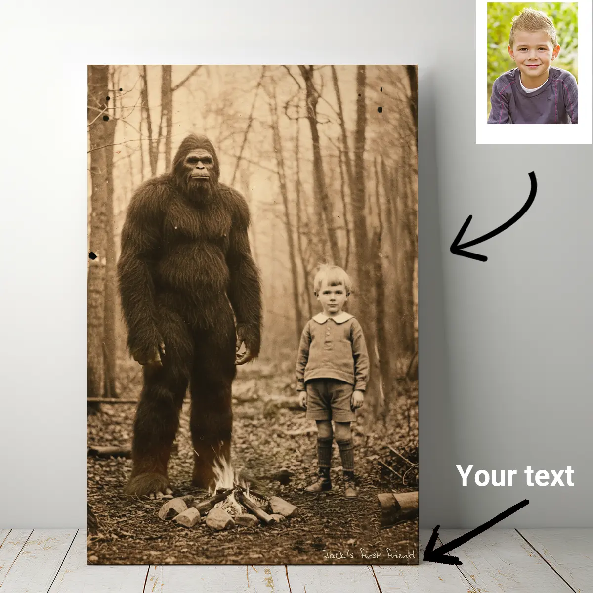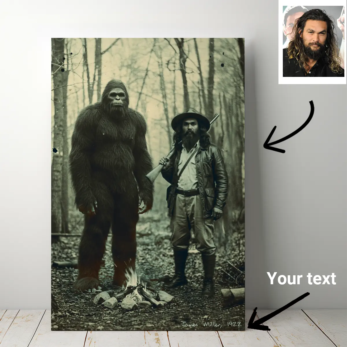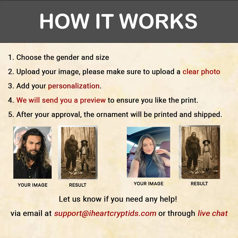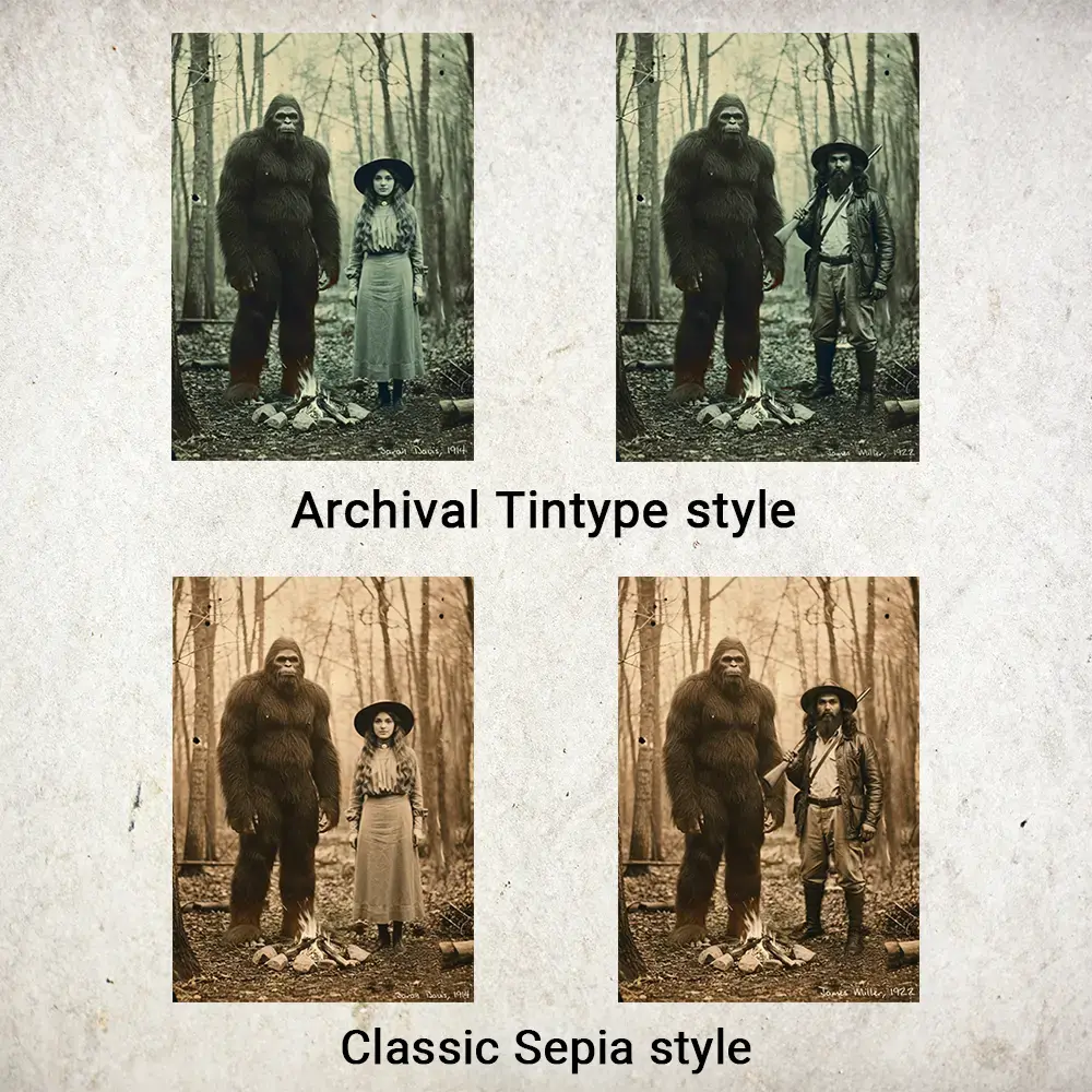 Become a part of history with a truly one-of-a-kind piece of art. This isn’t just a simple face swap—it’s a personalized portrait that places you, in stunning historical detail, right beside the legendary Bigfoot.