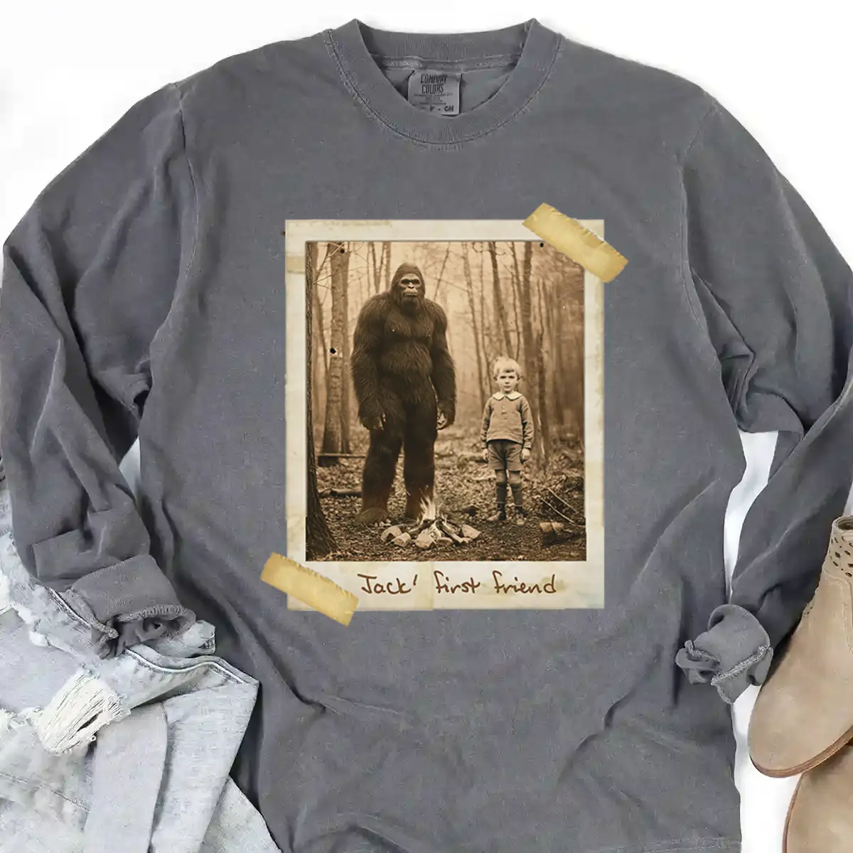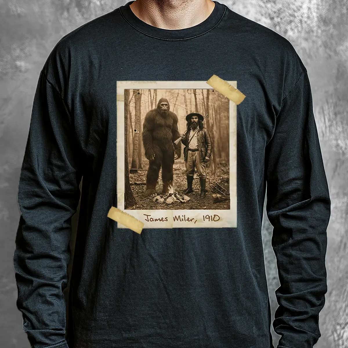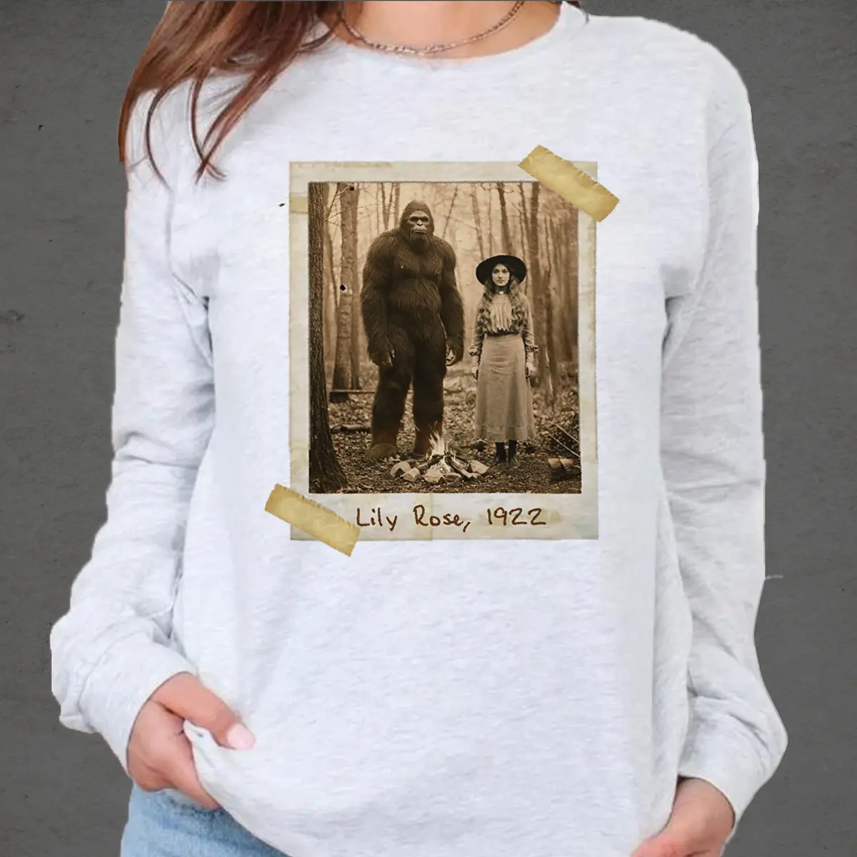 Our Personalized Bigfoot 1910s Portrait Long Sleeve Tee features a humorous and one-of-a-kind vintage-style photo of the iconic Bigfoot with a person in classic 1910s attire.