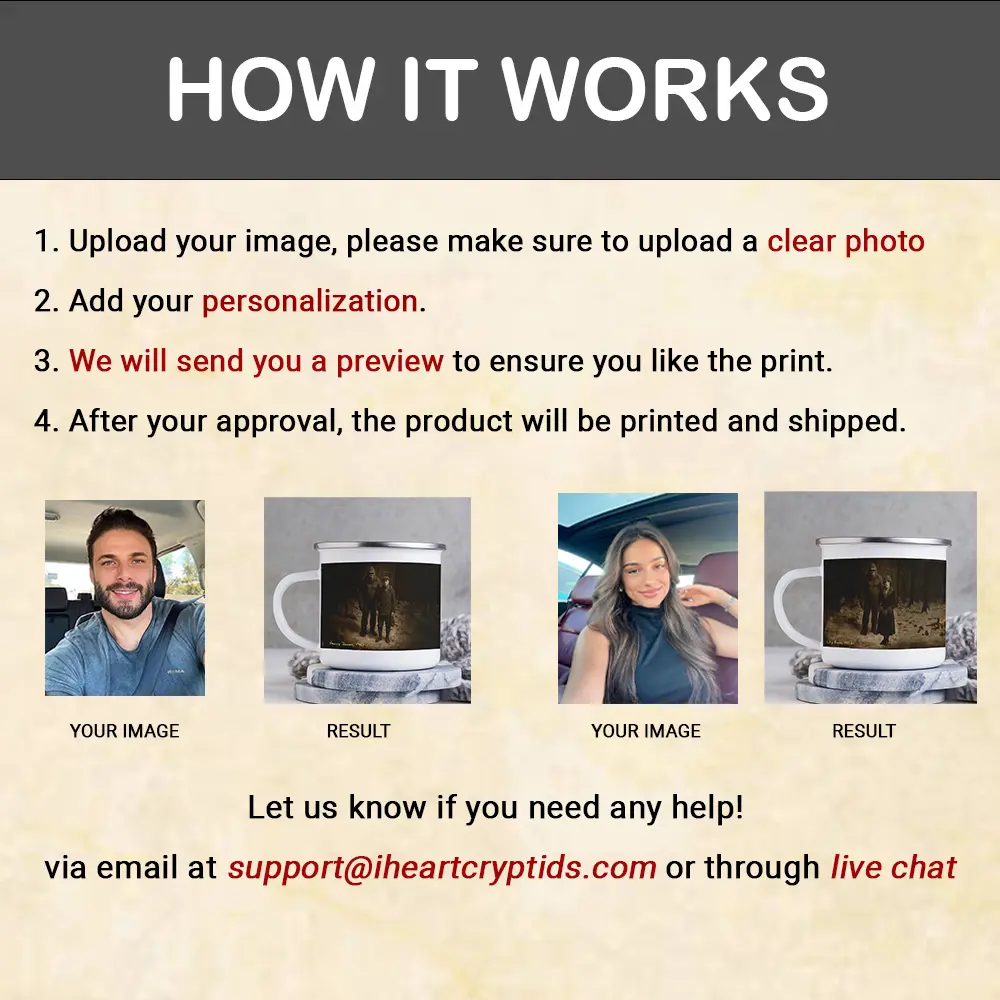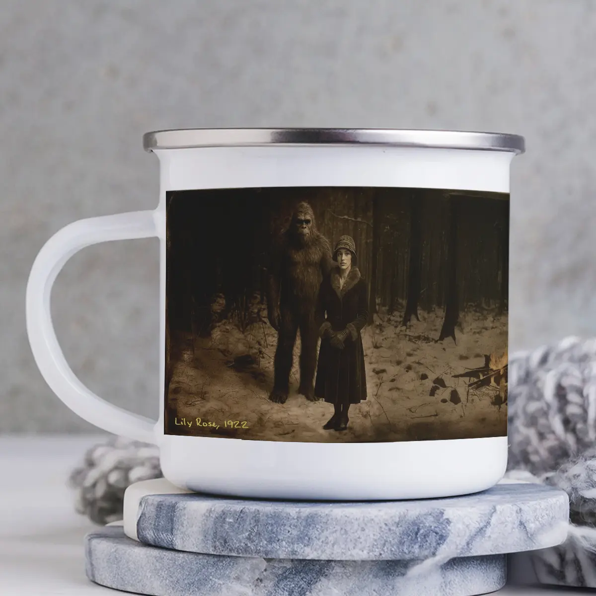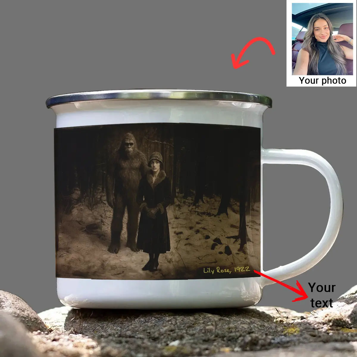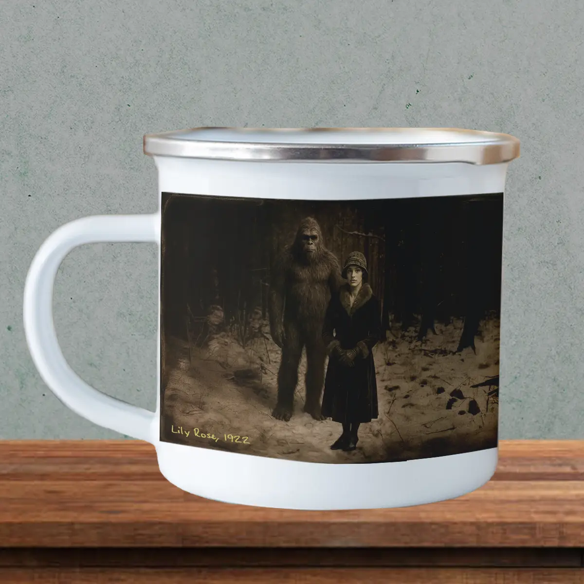 This Personalized Bigfoot 1920s Camping Mug features a humorous and one-of-a-kind vintage-style photo of the iconic Bigfoot with a person in classic 1920s attire. What secrets does the forest keep? This haunting artwork invites you into a bygone era, capturing a chilling, impossible encounter lost to time. We transform your photograph into an authentic vintage portrait, placing you face-to-face with the legendary sasquatch of the woods.