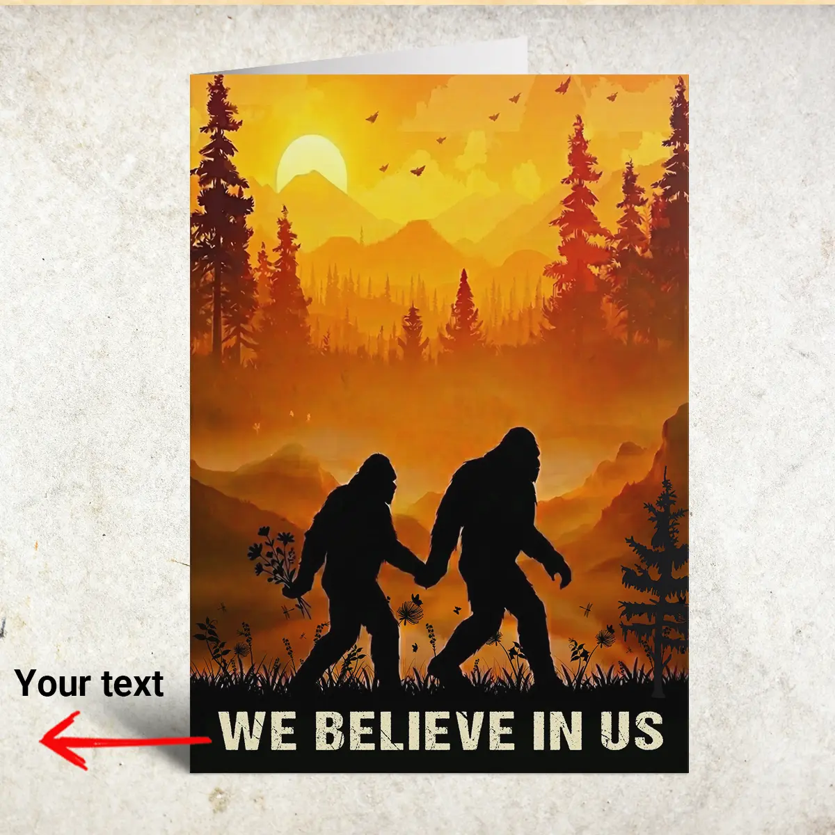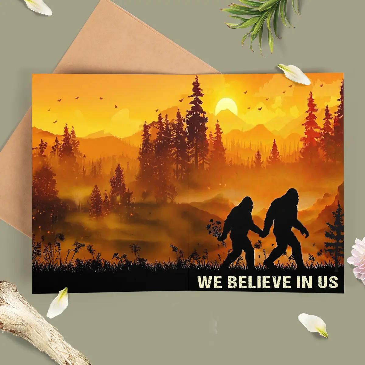 The card features two bold silhouettes of the Sasquatch, holding hands and walking across a rugged landscape, one even carrying a bouquet of flowers. They are set against a vibrant, fiery sunset, painting the sky and mountains in warm hues of orange and yellow. Tall pine trees frame the scene, emphasizing the vastness of nature, while subtle details like flying birds add life to this tranquil moment.