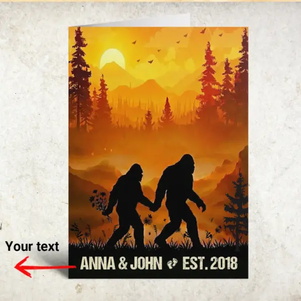 Celebrate your enduring love story with our Personalized Bigfoot Couple Card, a stunning tribute to your bond set against a breathtaking wilderness backdrop. This unique greeting card captures a moment of shared adventure, perfect for couples who believe in love as much as they believe in legendary creatures.