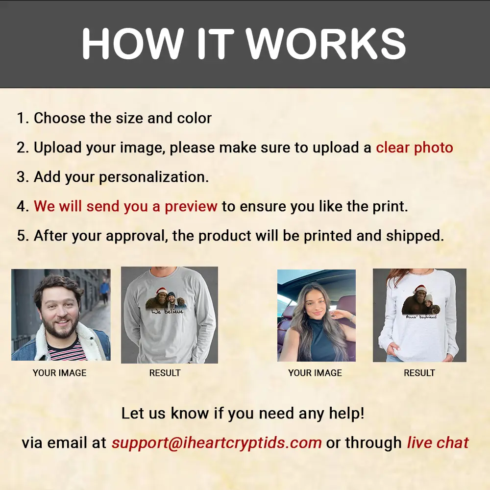Ever dream of meeting the gentle giant of the woods? Now, you can bring that magical holiday encounter to life! Our personalized artwork places you or a loved one right beside the legendary Bigfoot for a truly one-of-a-kind portrait.