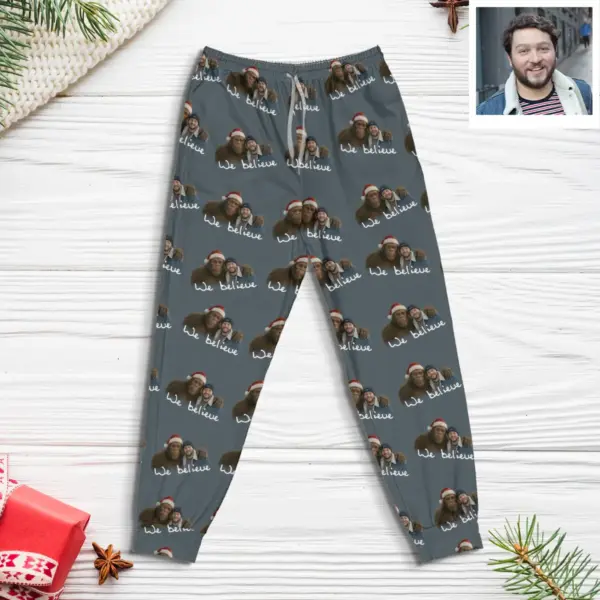 These Personalized Bigfoot Photo Christmas Pajama Joggers are funny custom Sasquatch gifts for the festive season.