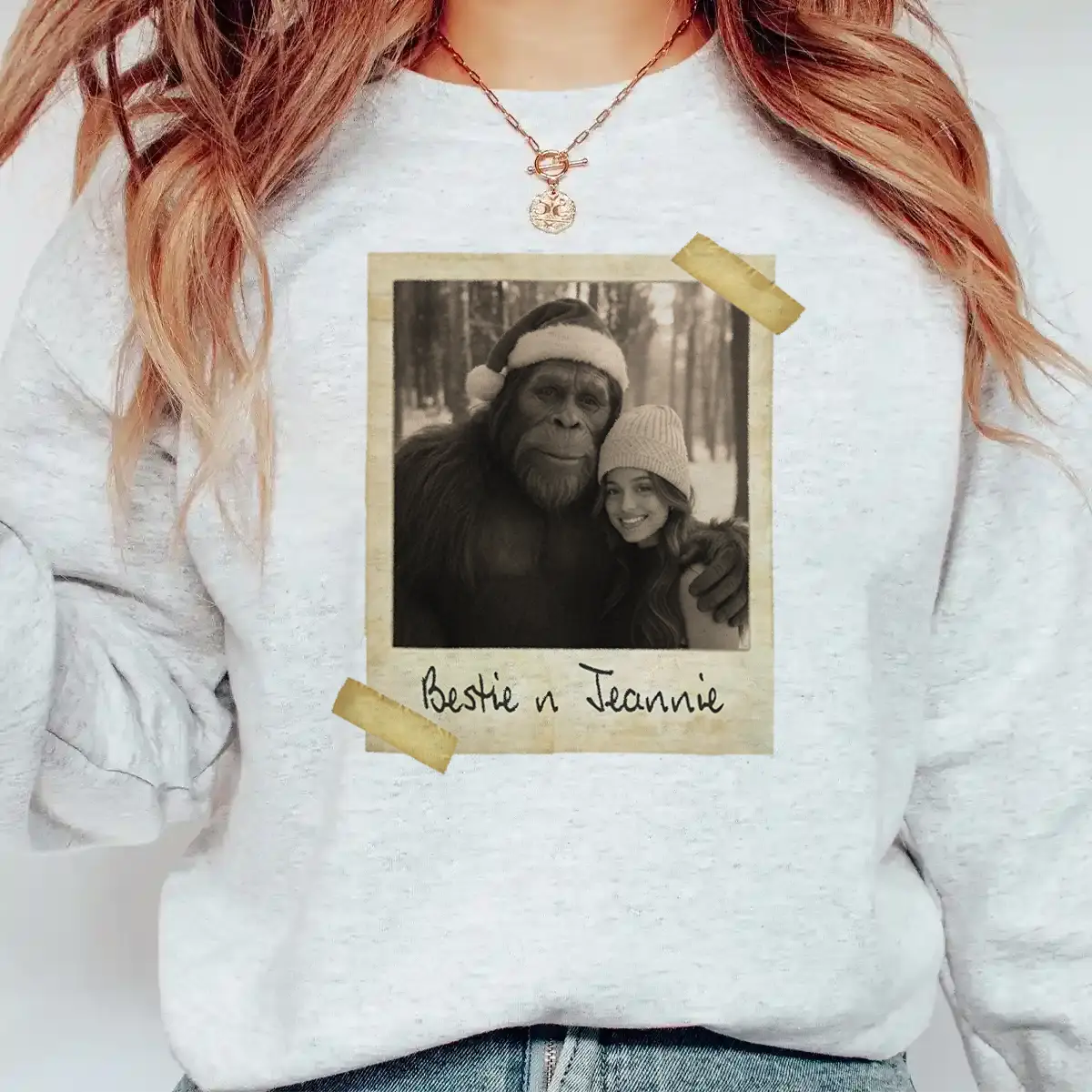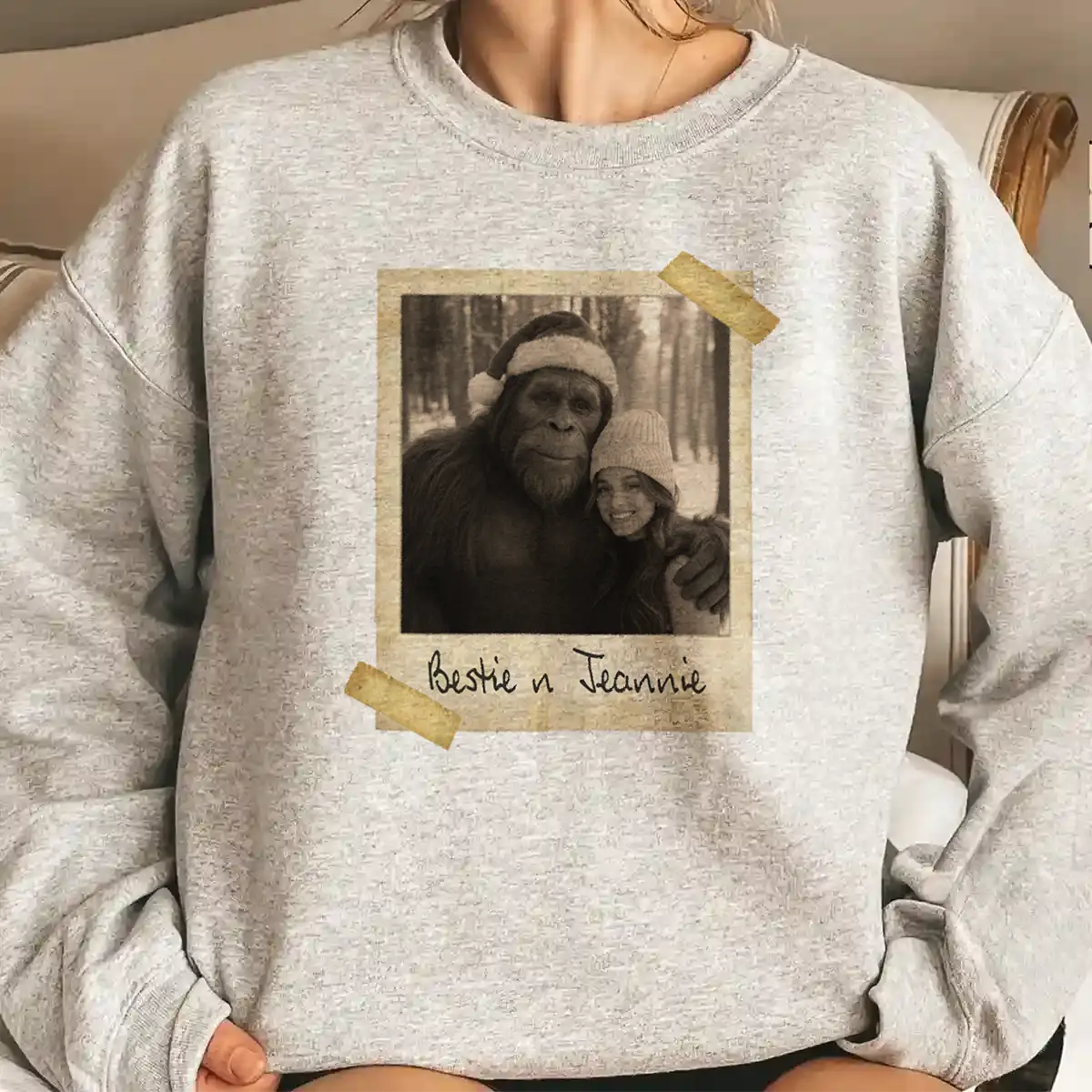 Our Personalized Bigfoot Photo Christmas Sweatshirt features a humorous and heartwarming image of the iconic Bigfoot in a Santa hat posing with your loved one in a vintage Polaroid-style photo.
