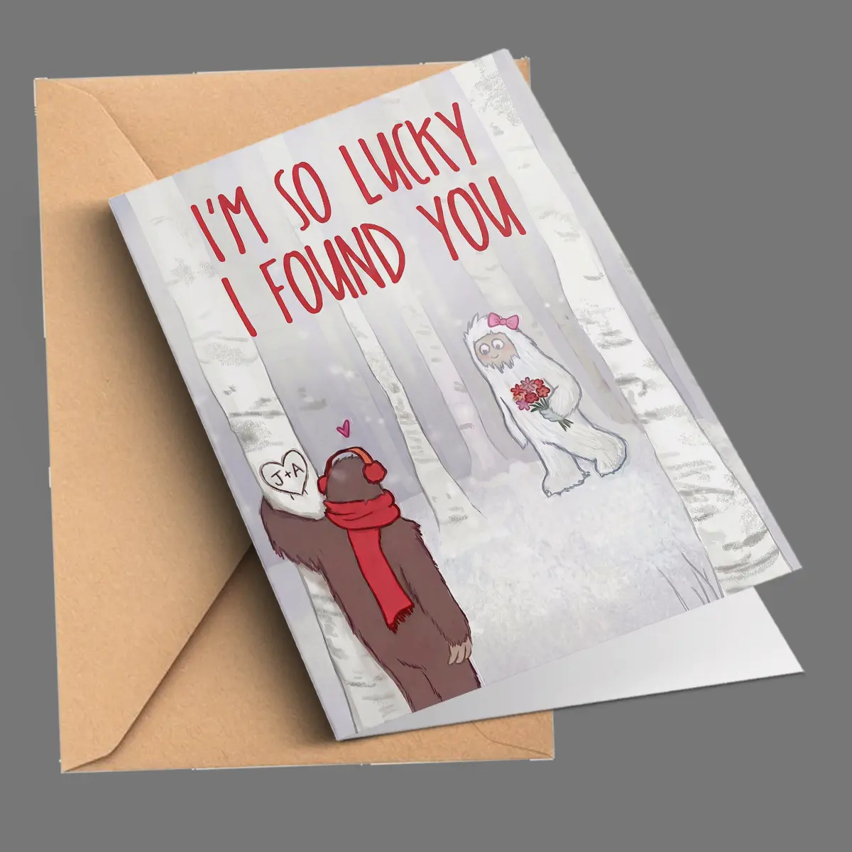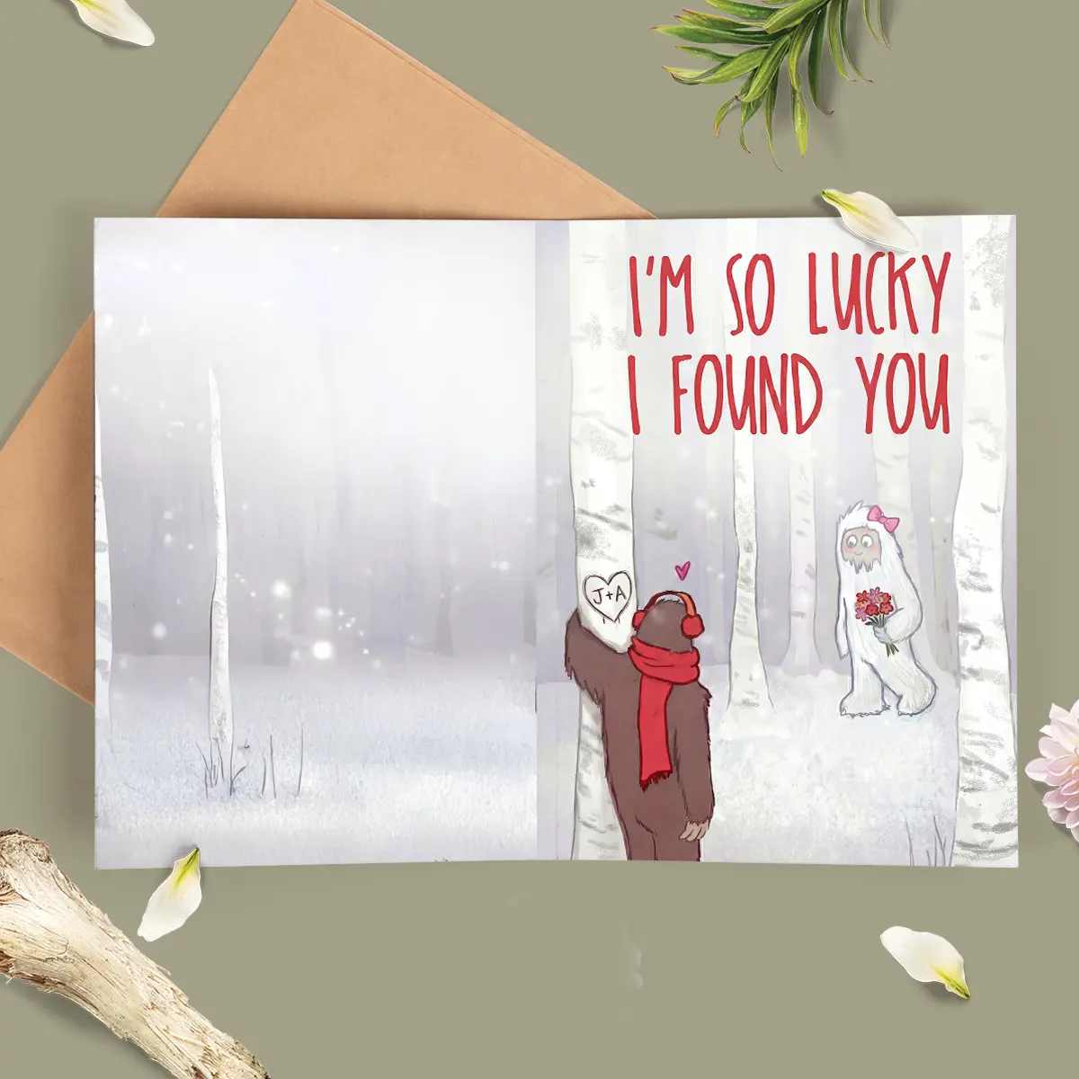 The charming artwork features a brown Bigfoot, adorned with a cozy red scarf and headphones, gazing over his shoulder at a sweet white Yeti holding a bouquet of flowers and wearing a pink bow. They stand amidst bare birch trees dusted with snow, under a soft, romantic sky. Above the Bigfoot, a heart carved into a tree trunk displays your custom initials, while the bold red text “I’M SO LUCKY I FOUND YOU” proclaims your profound happiness.