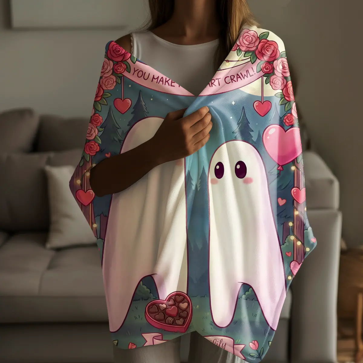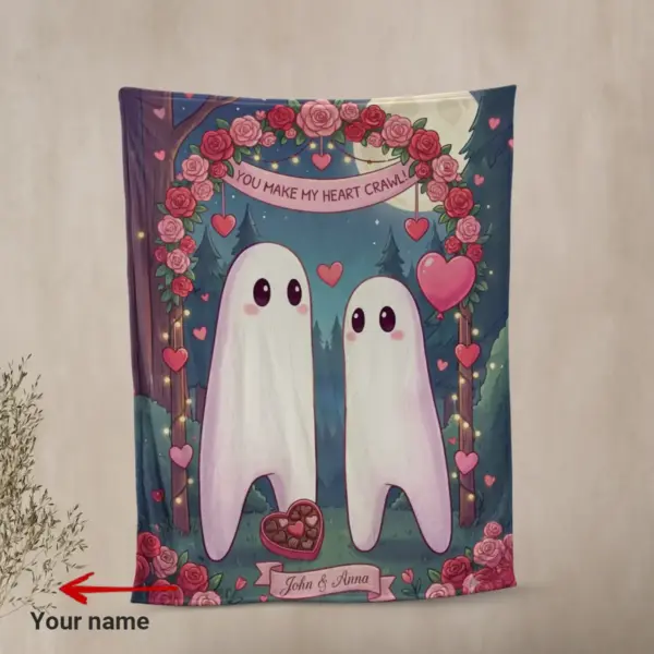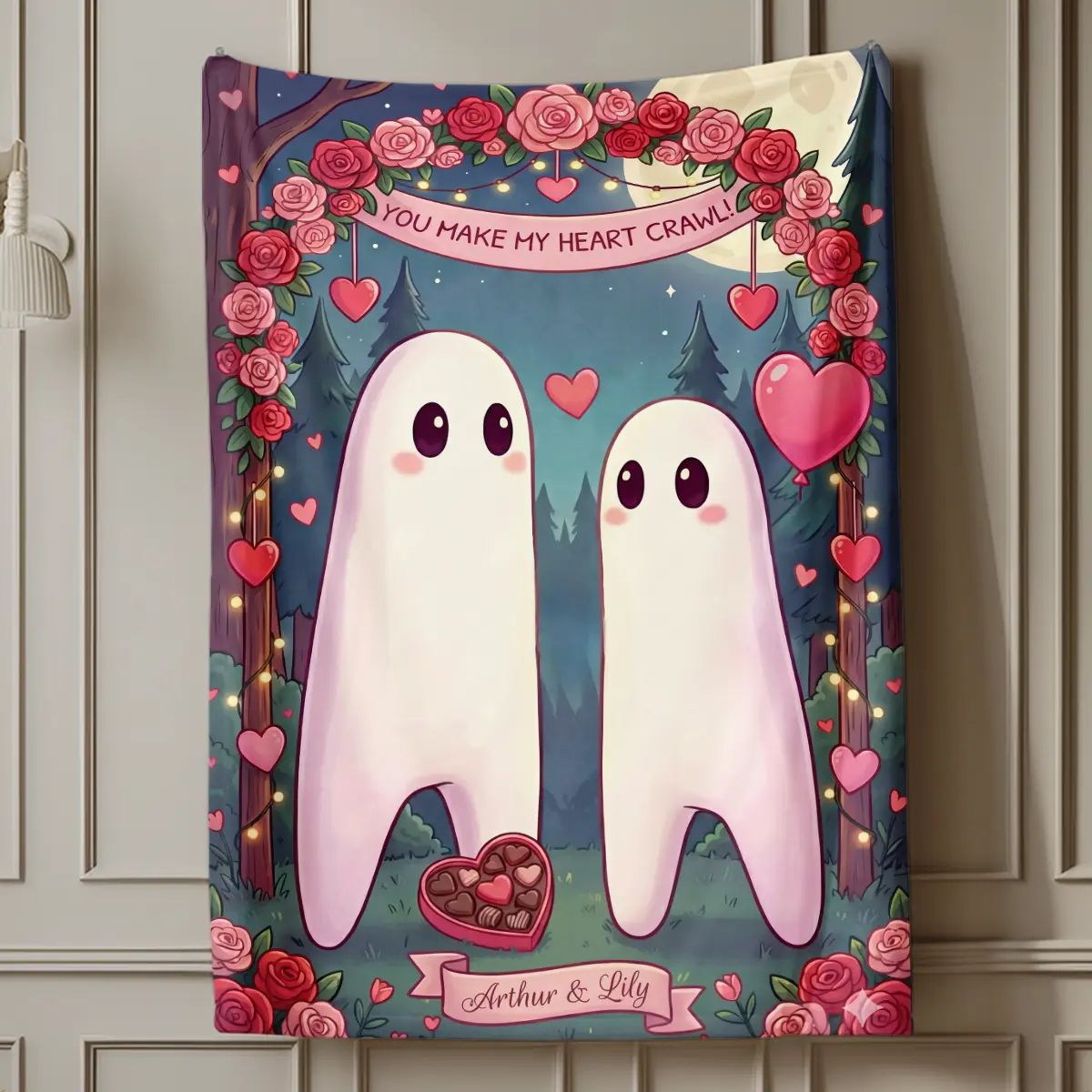 A banner above proclaims, “YOU MAKE MY HEART CRAWL!”, while a heart-shaped box of chocolates rests at their feet. It’s an ideal Valentine’s Day gift, blending quirky charm with a deeply romantic sentiment, perfect for snuggling up together and celebrating your out-of-this-world love.