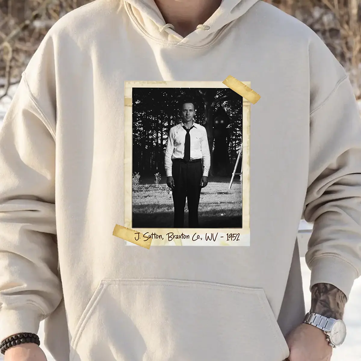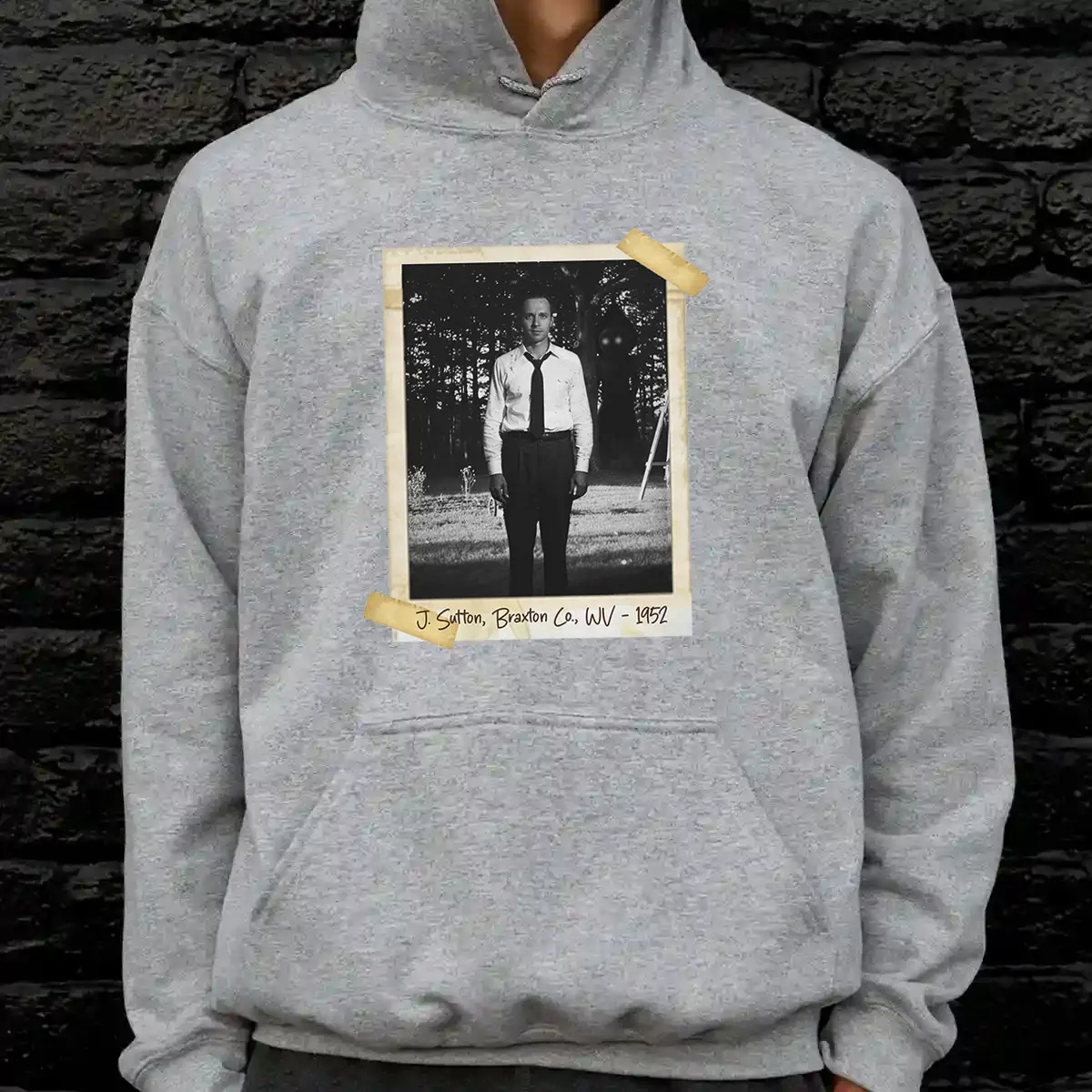 To complete this unsettling artifact, you can add your own personalized inscription (Ex: John Sutton, Braxton County, WV – 1952 or Kathleen May, The Sutton Farm, 1952) in the bottom corner. Write a name, a date, or a cryptic phrase to make this dark piece of history truly yours.