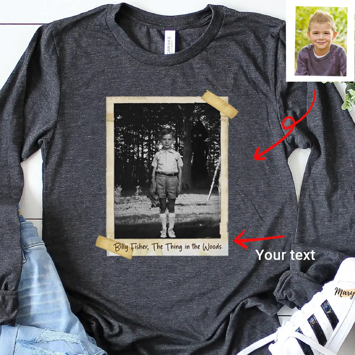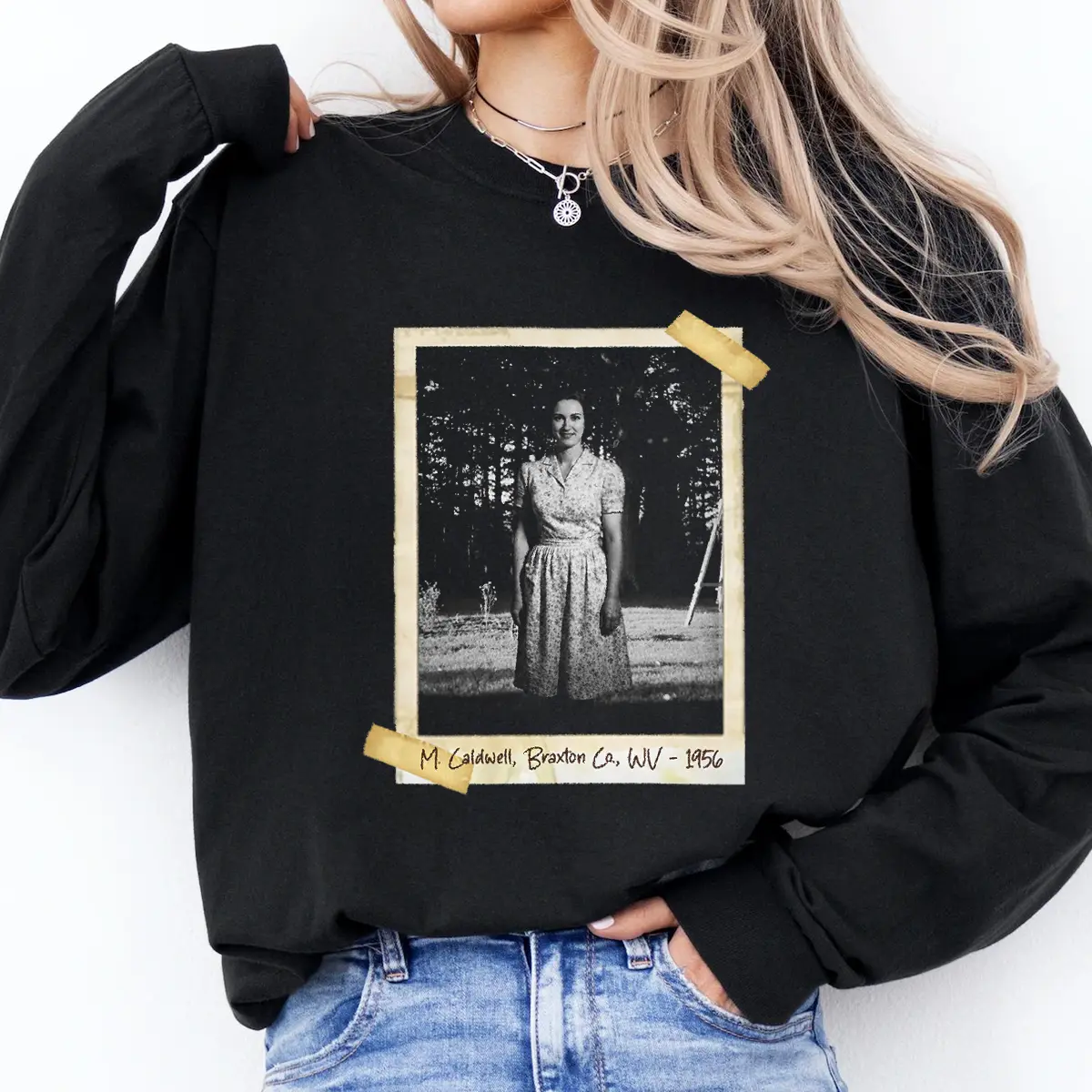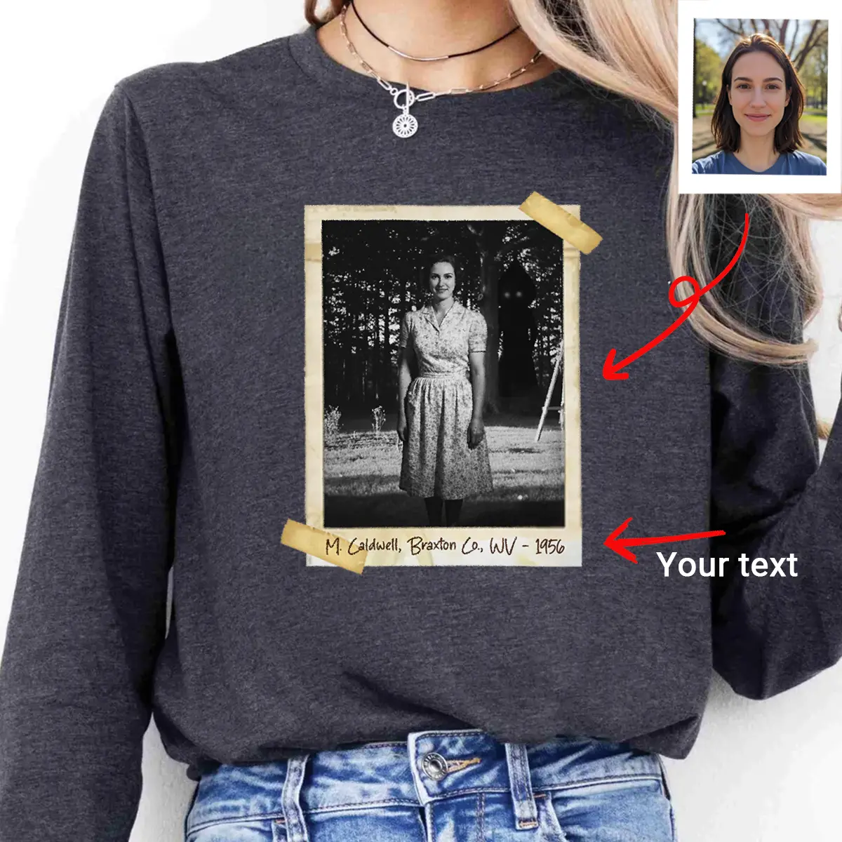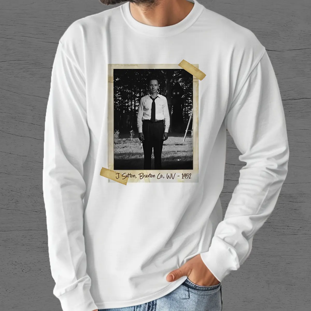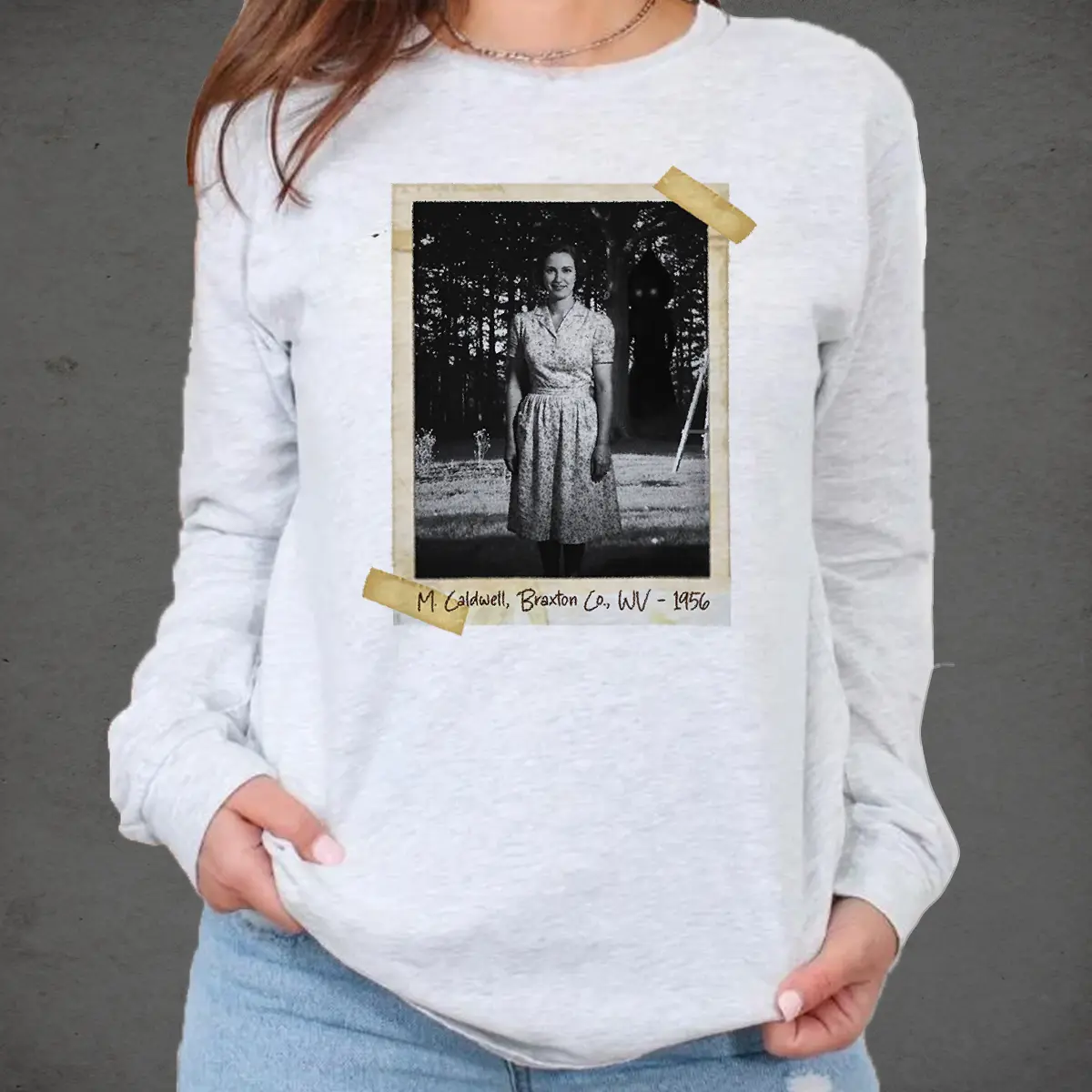 Step into a spine-tingling snapshot of the past with our Personalized Flatwoods Monster Horror Long Sleeve Tee.