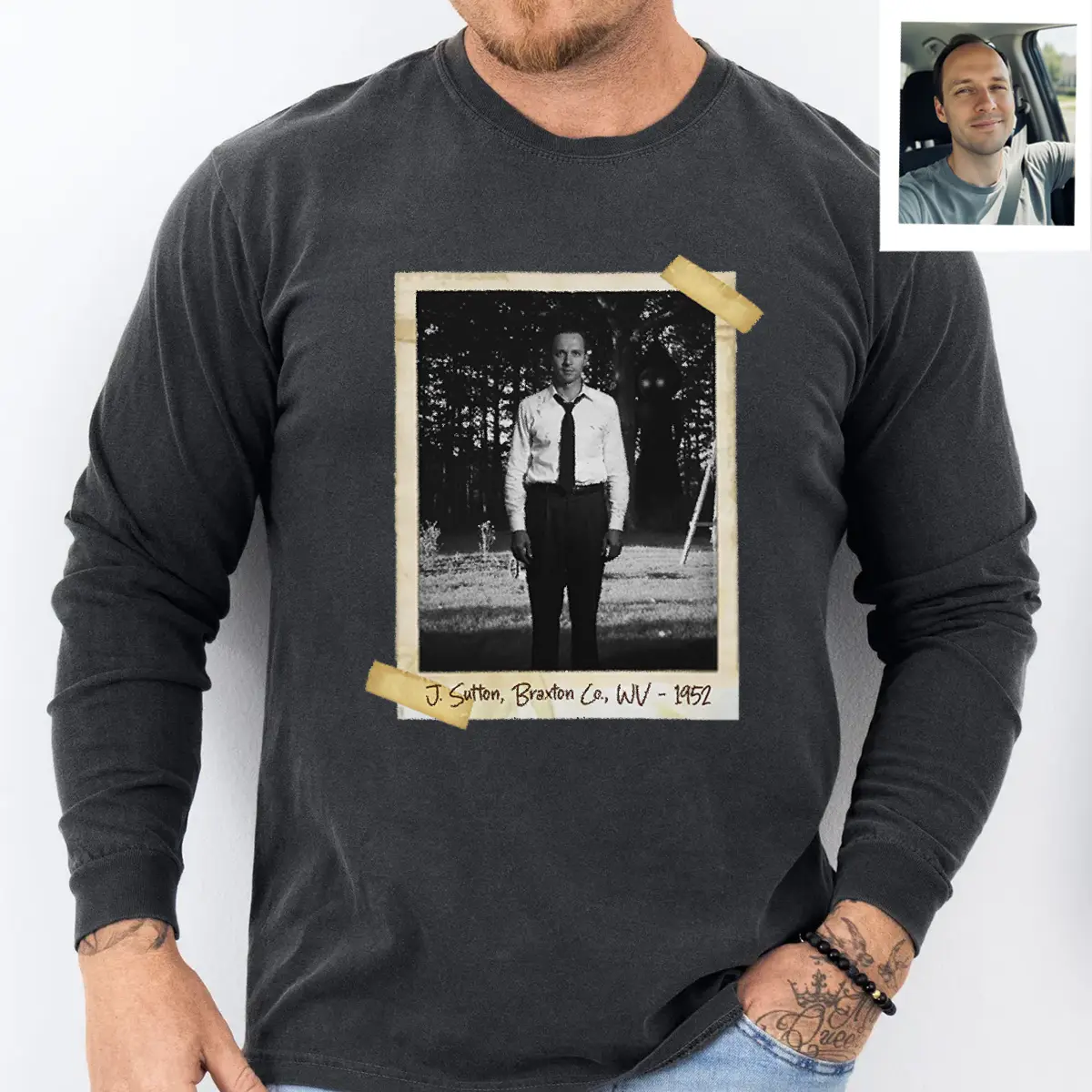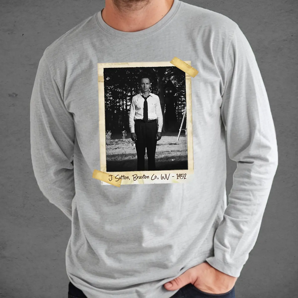 To complete this unsettling artifact, you can add your own personalized inscription (Ex: John Sutton, Braxton County, WV – 1952 or Kathleen May, The Sutton Farm, 1952) in the bottom corner. Write a name, a date, or a cryptic phrase to make this dark piece of history truly yours.