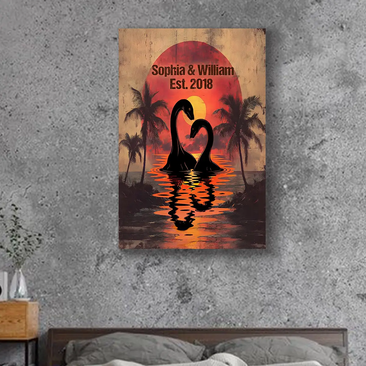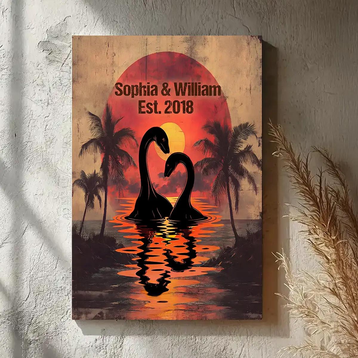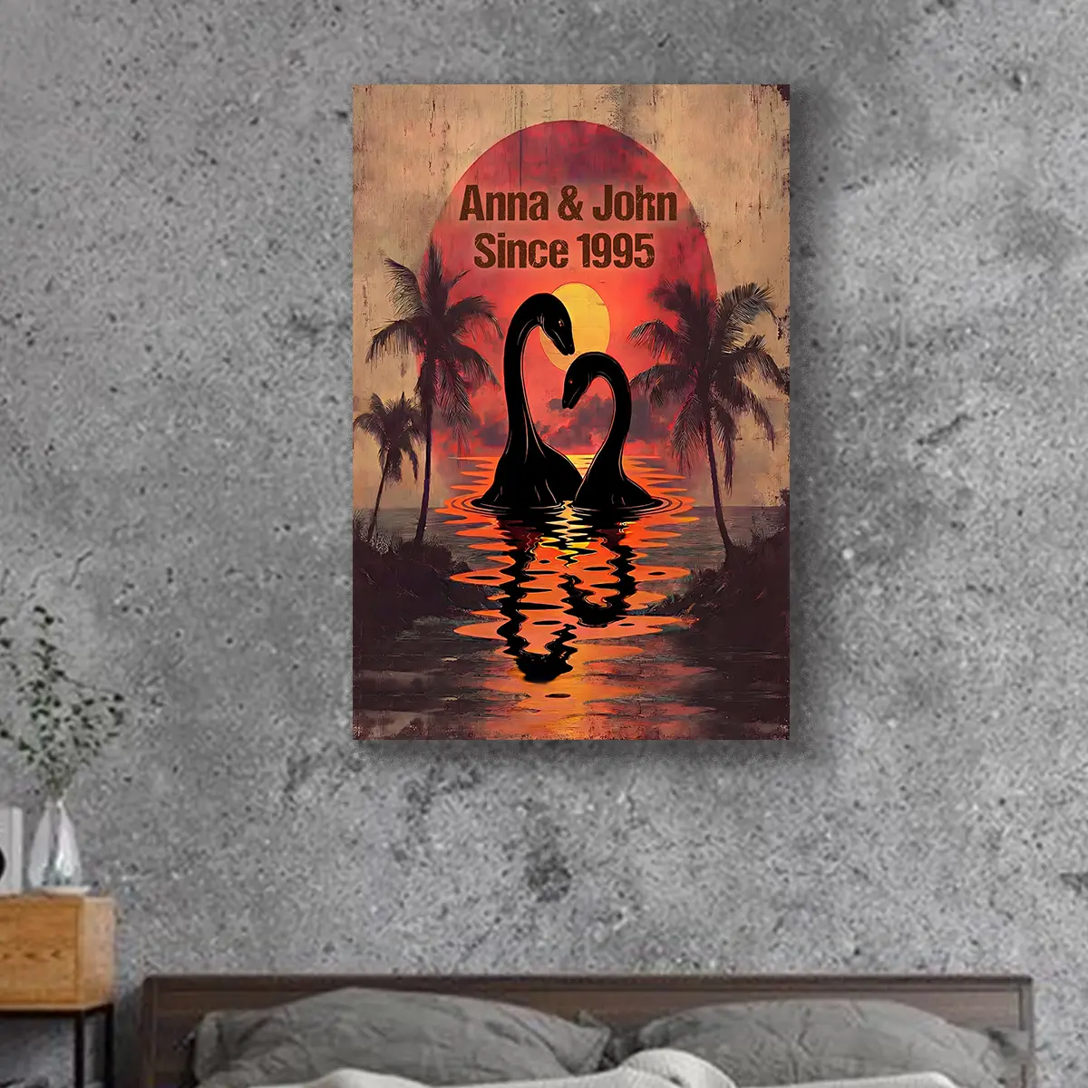 Personalized Nessie Couple Canvas | Retro Tropical Sunset Loch Ness Monster Valentine Anniversary Art