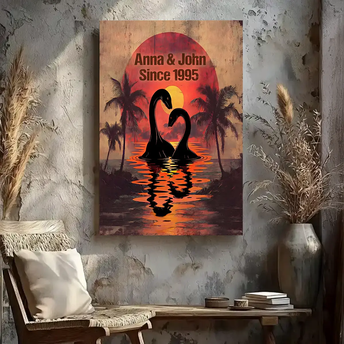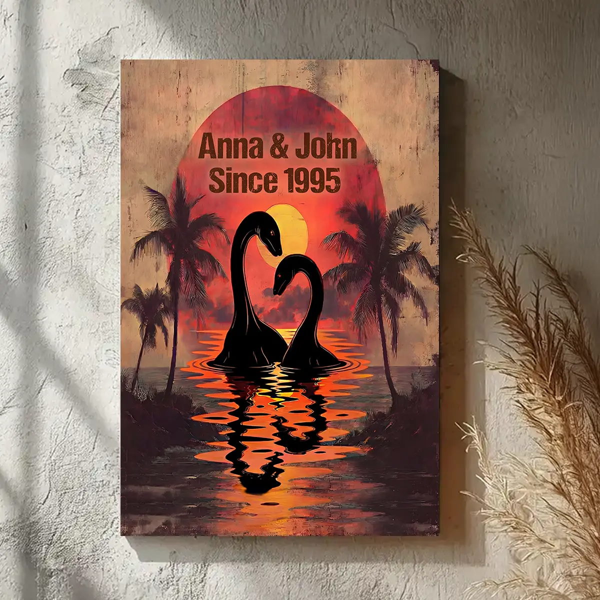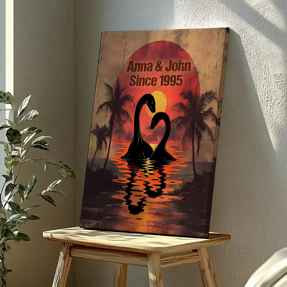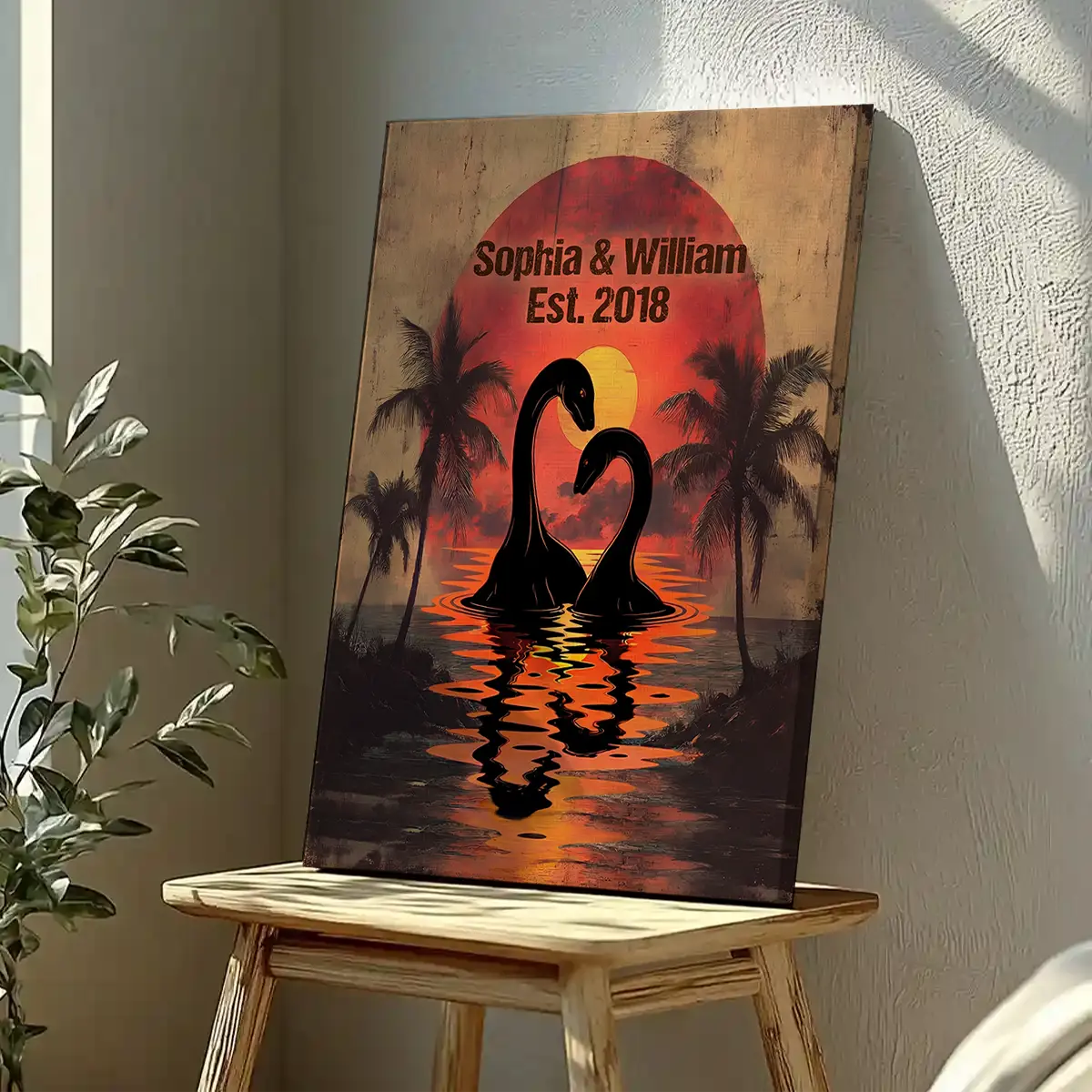 Personalized Nessie Couple Canvas | Retro Tropical Sunset Loch Ness Monster Valentine Anniversary Art