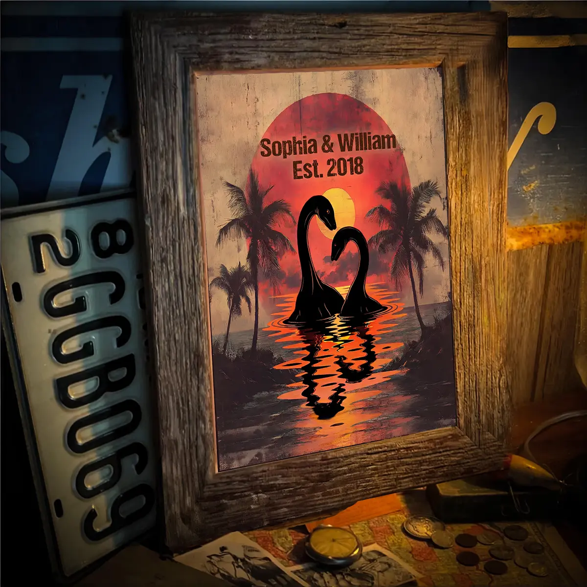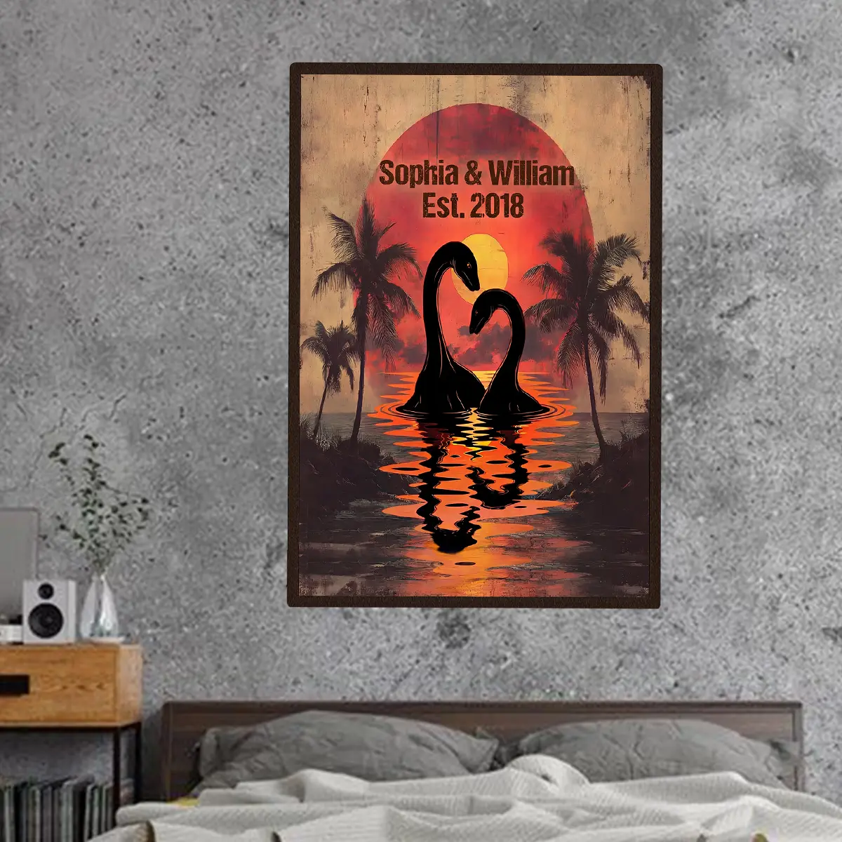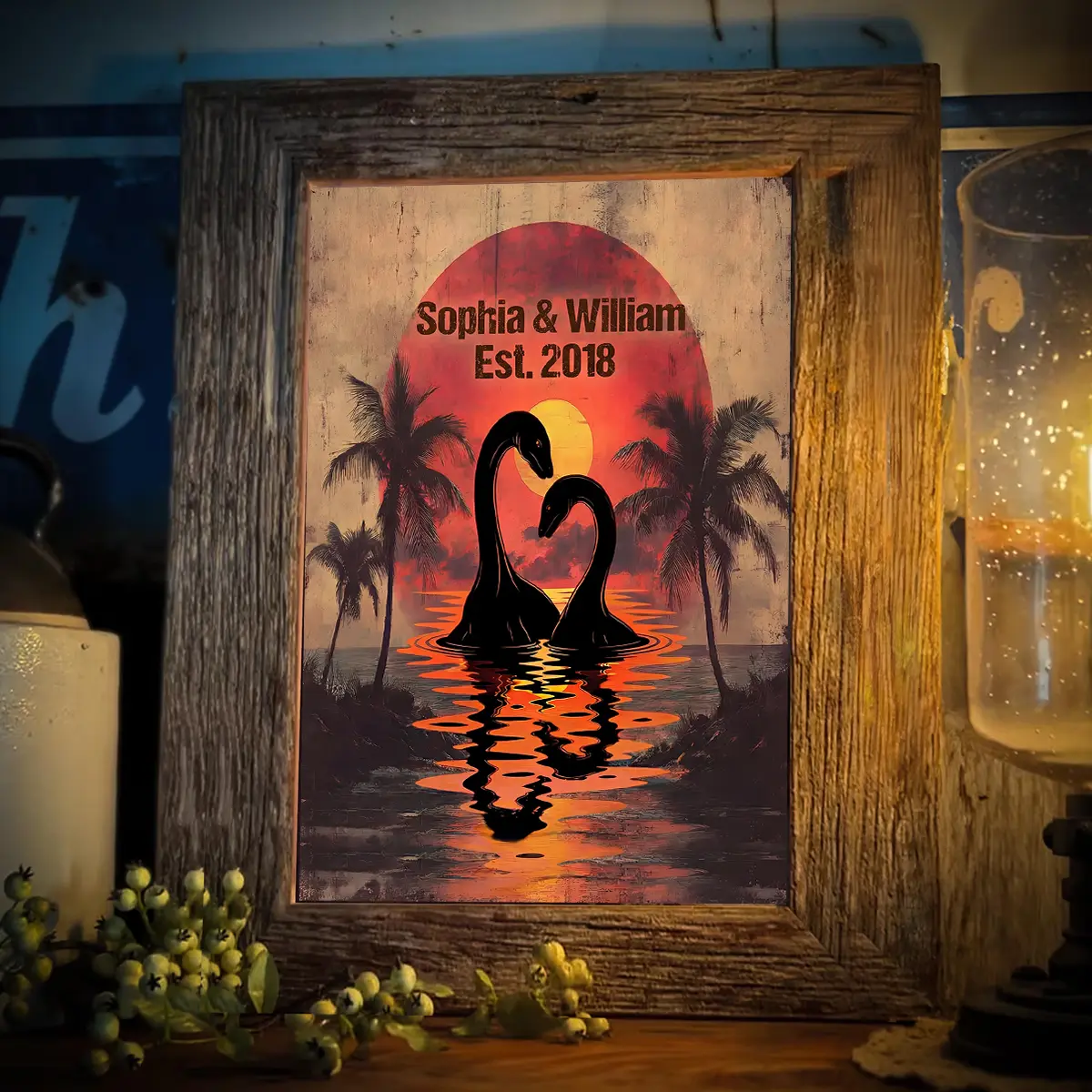 The artwork features two majestic silhouettes of the Loch Ness Monster, their graceful necks curving to form a perfect heart shape, symbolizing your intertwined love. They emerge from shimmering waters, reflecting a vibrant retro sunset in warm hues of orange and red, framed by silhouetted palm trees. The artistic reflection on the water adds a dynamic and romantic touch to the overall scene, creating a sense of an exotic, timeless moment.