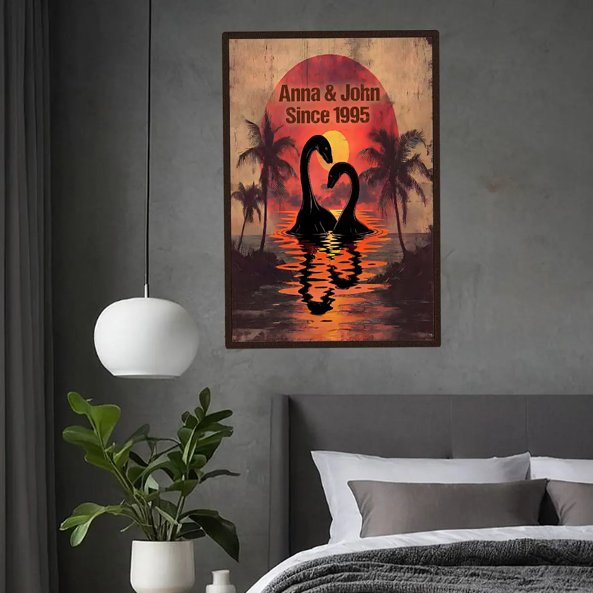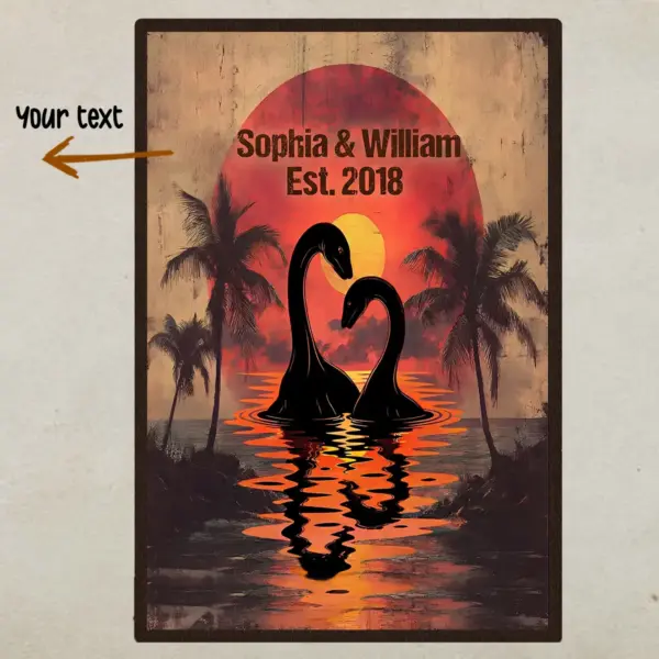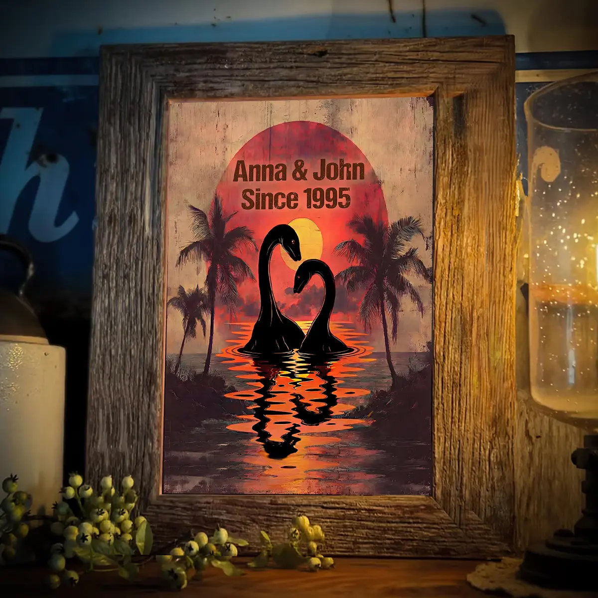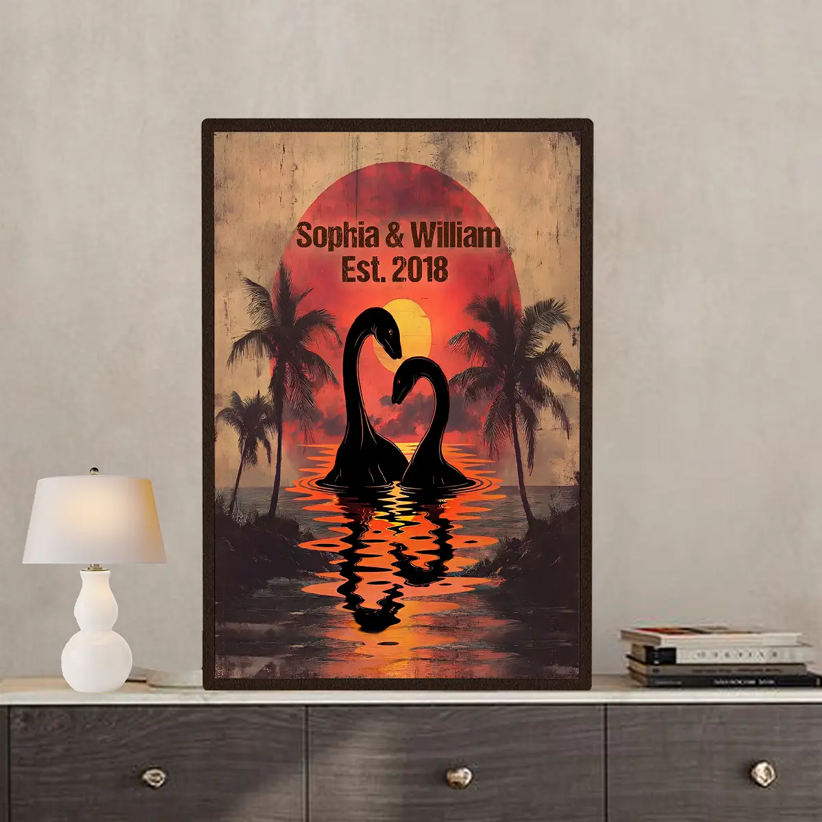 The artwork features two majestic silhouettes of the Loch Ness Monster, their graceful necks curving to form a perfect heart shape, symbolizing your intertwined love. They emerge from shimmering waters, reflecting a vibrant retro sunset in warm hues of orange and red, framed by silhouetted palm trees. The artistic reflection on the water adds a dynamic and romantic touch to the overall scene, creating a sense of an exotic, timeless moment.